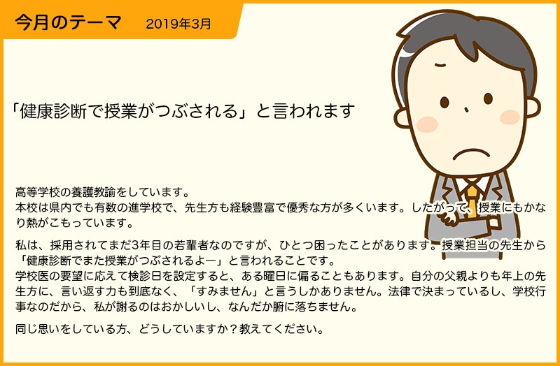 20年目の養護教諭です。小学校に勤務しています。私も謝る必要はないと思いつつも、頭を下げて快くやってもらえるならと思って、「すいません」とよく言っています。でも本来は、健康診断は子どもの健康を守るために必要なものです。ですから、謝る必要はないですよね。もちろん、準備をしっかりして、無用に待たせる時間を作らないようになどの工夫は必要です。授業の時間を減らされたくないという職務に対して熱心な先生であることは理解しつつも、健康診断の必要性を訴えていくしかないと思っています。 |