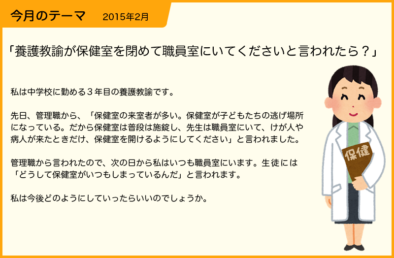 [SLIPERより] たくさんのご意見ありがとうございます。 「保健室を閉める」という話、時々耳にします。皆様のご意見から、その状況を予防する方法、回避する方法、閉めたときに取る方法があることがあることに気づくことができました。多くの養護教諭にとって役立つ示唆が得られたものと思います。 いただいたご意見に共通していたのは、「養護教諭の動きが学校のため、子どものためになっていることを学校全体に理解してもらうこと」の大切さではないでしょうか。養護教諭としてどんな保健室経営をしたいのか、子どもや学校にどんな貢献ができるのかを明確にし、そのためにすることを他の教員や子どもにわかる言葉にし、説明することが求められているのでしょう。保健室のルールを明示したり、保健室での子どもの様子を学校全体に伝えたりすることからスタートしてみましょう。 スキルラダー研究会では、「思いがなければ技術は身につかない、技術がなければ思いは届かない」という信念を掲げています。ここでいう「技術」とは、「職務を見える形にすること」です。養護教諭がどんなに子どものためを思っていても、結果や成果が見えなければ教員どころか子どもにも伝わらないのではないでしょうか。 |