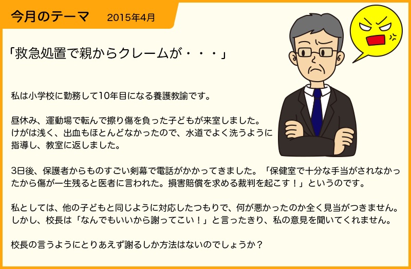 それは大変ですね。あなたは普通に救急処置をしたのに、保護者は「裁判を起こす」と言っている、校長は「何でもいいから謝ってこい」と言うだけ。 驚くと同時に恐怖さえ感じてしまいますよね。でも、この話にはおかしな点がたくさんあります。 おかしな点①、あなた(相談者)自身が何が悪かったのか全く見当がつかないこと。 おかしな点②、「保健室で十分な手当てがされなかったから傷が一生残ると医者に言われた」と、保護者が言っていること。 おかしな点③、「損害賠償を求める裁判を起こす」と保護者が言っていること。 おかしな点④、校長は「何でもいいから謝ってこい」と言っていること。 順不動ですが、考えていきましょう。 ①について。軽い擦り傷と判断し、水道で洗うように指導したとのことですが、つまりあなたは消毒等、直接の手当てはしなかったのですね(もちろん、こういうこともあり)。部位がどこなのか不明ですが、子どもが傷口をしっかり洗ったかの確認をしましたか。また、転んだ時に、強い打撲をしていたり、その場所に神経や重要な血管があったかもしれません。痛みの具合はどうだったでしょうか。内出血などはなかったでしょうか。その後傷口から感染して炎症を起こしたかもしれません。…などなど、何か思い当たることがあるはずです。もしかしたら、この保護者は常習のモンスターペアレンツだったりして…。もしそうだったら、別の対応も必要になります。いずれにしても、プロとして、日ごろの勉強や訓練を積み重ねていく努力をしていても、完璧はありません。何かあったとき、一つ二つ思い当たることがあって当然です。 ④について。「裁判を起こす」とは、大きな問題です。まずは校長が保護者に対応すべきでしょう。「申し訳ありませんでした」とまずあやまるのは校長のほうです。さらに「つきましては養護教諭他、関係者に状況を確認させ、養護教諭への指導をしたいと思いますので、子どもさんの様態、受診状況など、お話を聞かせていただけますよう、ご協力をお願いいたします」と言います。ここの校長はその技量がなさそうなので、学校内で最も信頼のおける、実力のある先生に相談し、管理職を説得してもらうようにします。もちろん、あなたは誰へも「申し訳ありません」を言っておきます。 ②について。保護者が電話で訴えたことなので、本当に医師が「保健室での手当てのせいで傷が一生残る」と言ったのか疑問です。事実関係を確認する必要があります。あなたはその子どもの様態や状況、経緯をしっかり観察、把握します。その子の診察に当たった医師に会って状況を聞きます。事実関係、救急処置のミスの有無、その上でこれが訴訟に値するものなのかも聞きます。また、学校医に相談してもいいでしょう。 ③について。①、②、④を進めていくうちに、これが裁判に発展していくものかどうかの判断はつくでしょう。最悪、あなたのせいで一生の傷が残るという結果になったとしても、学校側や養護教諭のまじめで真摯な姿勢が、保護者との合意を得るものと信じます。 |