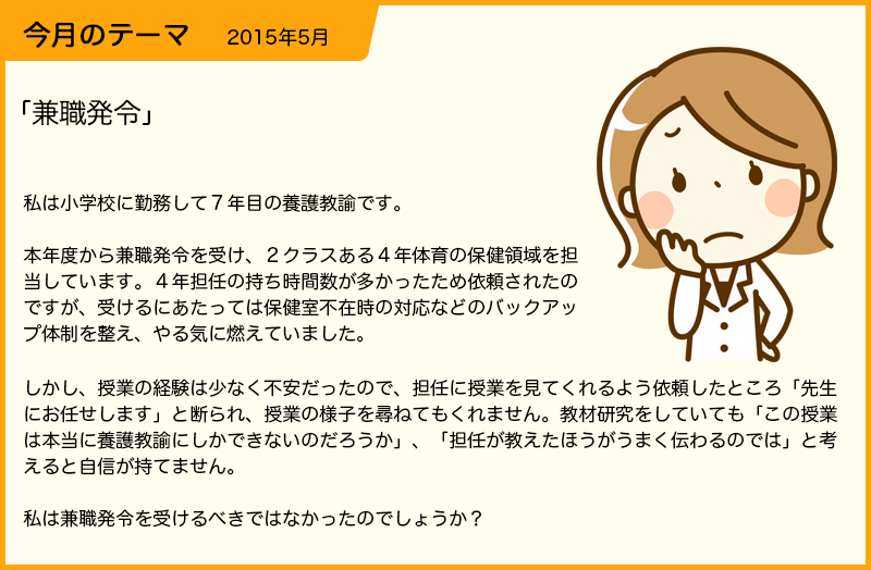 「兼職発令を受けるべきではなかったのでしょうか?」の質問ですが、私の答えは、あなたは保健室のバックアップ体制を整え、やる気に燃えて受けているのですから、ここは責任を持ってその任務を果たすべきと思います。小学4年生2クラスの保健の授業を年間を通して行うということでしょうから、準備等を含め大きな負担が生じますね。でも、やる気に燃えるあなたならできます。担任が「あなたにお任せします」と言っているのは、あなたを見て「この人なら大丈夫」と思っているからでしょう。「任せてください」とまでは言えないでしょうが、ご自分のやり方で、ある意味自由に授業ができるのですから良い機会、修行の場として捉え、頑張ってください。1年が経過するころには、授業は上手になり、兼職発令に関しても新たな考え方ができるようになることでしょう。 私も25年間の養護教諭勤務の経験がありますが、兼職発令を受けたことはありません。が、自ら機会を作って教室に出向いていきました。特に「性に関する指導」には力を入れ、子供たちが本当に知りたいこと、大人が本当に教えるべきことを研究し、私独自の「性教育」をあみ出し、教えてきました。また、県教委と高校に勤務していたとき、養護教諭養成大学から依頼され「養護教諭の執務」という教科を8年間担当したことがあります。教科書はあったのですが、私の授業は「きょうは保健指導について講義します。教科書はあとで読んでおいてください。私の経験を話します。」と言って授業を展開していきました。まさに養護教諭だからできる授業です。とても人気の授業だったのですよ。 さて、兼職発令をどう考えるかですが、私も他お答えくださった先生方とほぼ同じように考えています。養護教諭の専門性を生かした授業をするためには、兼職発令のような担当の仕方は難しいと思います。が、学校の規模や状況、ご自分の実力等を考慮しながら判断することも必要でしょう。 追加ですが、得てして養護教諭は「人前で話すのは苦手」という人が多いようです。でも、人前で話せるように訓練してください。養護教諭として子供や親、先生方に理解を得るような話し方を考え、練習してください。それはそれはいい勉強になります。そして養護教諭としての総合能力を磨いてください。 余談ですが、12年前、私がアメリカに渡ってすぐのこと、大統領の中間選挙がありました。ブッシュ氏とケリー氏の対決です。その時、ケリー氏の応援演説に立ったのが現大統領のオバマ氏でした。彼のスピーチは素晴らしかった。英語も良く分からない私でしたが、TVの前に釘付け、「この人が大統領になれば良いのに」と思ったものです。 |