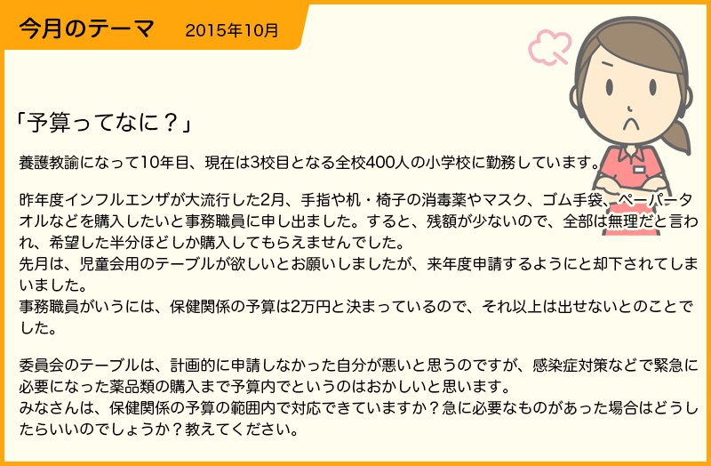 質問を読んで、私も予算に関して苦労していたと懐かしく思いました。 新しい備品は古いものが壊れたりしないとなかなか買ってもらうことができなかったのですが、こんな事例がありました。中学校に勤務していた時に、100㎏を超える体重の男子がいました。学校にある体重計は100㎏までしか測ることのできないもので、2台の体重計に片足ずつのせて測ることでまかなっていました。しかし正確に測ることはできず、その生徒にも恥ずかしい思いをさせてしまっていたので、管理職と事務職に申し出て「生徒のために購入をお願いしたい」と伝えたところ、1カ月程でセパレート式のデジタル体重計を購入いただけました。これは極端な事例かもしれませんが、子どものためにどうして必要なのかを根拠を持って説明することで、購入に結びつくのではないかと思います。そもそも、予算は大事な税金ですからね。 また、緊急に必要になった消耗品についてですが、古い話になりますがO-157が流行した時に緊急予算が各学校に支給され、消毒薬等購入した記憶があります。これはまれな例かと思いますので、決まった予算の中で先を見通して予算執行していくのも養護教諭の腕の見せ所と思います。 現在大学教員をしていますが、予算について学生に話をしたことがなかったです。学生と学校予算について話をしてみようと思います。 |