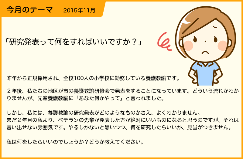どういう意図で先輩があなたに頼んだのか想像すると、自分は研究発表はなるべくさけたい。なぜなら、面倒、忙しい、これまでに発表経験もある。大学卒業間もない養護教諭は卒論等、研究に慣れていると思っている。「何かやって」ということはすべてあなたに「まるなげ」している。先輩としての後輩育成の責任感がない、ように見えます。 また、発表地区になっているというのは輪番制の可能性がある。ということは市内の学校では積極的に研究している養護教諭がいない。研究は大変なのでなるべくしたくないと思っている。研究テーマが見つからない、または特に重要な問題は発生していない。やる気がない。誰もやりたくないので仕方なく輪番制にしているように見えます。 研究は教職員の義務であり、プロの職種には欠かせないものです。養護教諭自身がする研究をもっともっと大事にしていかなければなりません。毎日の執務の中で疑問に思うこと、分からないことはたくさんあります。「教えて達人」コーナーでこれまで取り上げてきた内容を見ただけでも研究材料はいくらでもあるわけです。 そこであなたのすることは、 ①あなたの地区(当番地区)の会であなたが指名された理由を聞く。輪番制でいつも新任がやる習慣があるのかもしれない。いずれにしても、あなたは「ここは勉強の機会」と思って引き受ければいいと思います。 ②でも、やる以上は内容のある研究発表ができるよう、しっかり準備しましょう。 ・研究内容を検討‥‥これまでの市内の研究の経緯と内容を調べる。あなたの地区として何か研究したいテーマがあるか、研究して欲しい内容があるか地区養護教諭会に聞く。あなた自身が日ごろ養護教諭として悩んでいること、知りたいことを整理し、研究テーマになりそうなものを考えてみる。 ・場合によっては個人研究ではなく地区全体としての共同研究になる可能性もある。その場合は地区としての研究体制ですすめ、あなたは発表するだけになるかもしれません。 養護教諭の研究会は地域から全国規模までたくさんあります。そのうちの多くは惰性で進められているように私は思います。しかし、このコーナーをご覧のみなさんは真剣に目の前の問題に取り組んでいます。毎回立派な研究を発表しているのと代わりません。仲間を増やし、良い研究を続けていきましょう。 |