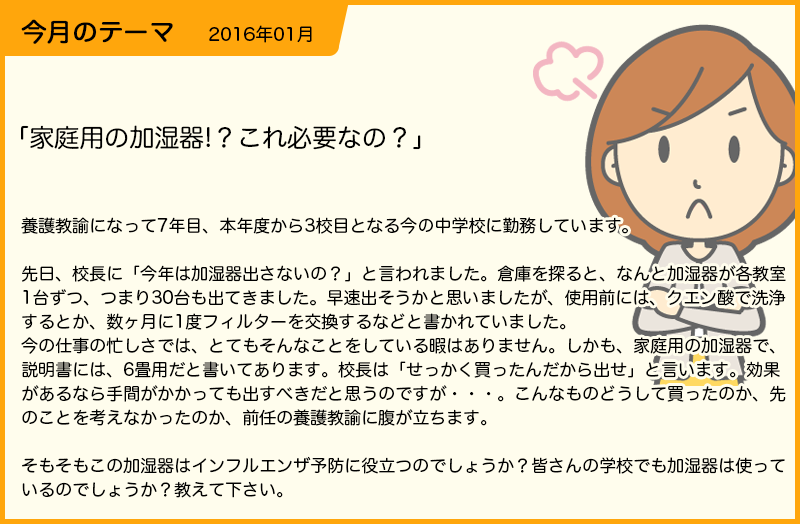 このケースの場合、私の結論は「この加湿器は風邪予防の効果が見込めないので出さなくてよい」です。でも、実際問題として校長に言われているし、前任の養護教諭が買った物のようなので、ただ「出したくありません」と言うこともできない。では順序だてて考えてみましょう。 質問の趣旨は、あなたは①この加湿器はインフルエンザ予防効果がない、また②使用するのに養護教諭の手間がかかりすぎると思っています。そして最大の疑問は「学校に加湿器が必要か」というものです。その疑問を養護教諭の立場で研究検証していきましょう。 加湿器は保健関係の学校備品に入るのでしょうね。他にも似たような例で「歯ブラシ消毒器」や「手指消毒液」などがあったのを思い出しました。これらの購入設置に当たって、当然養護教諭の専門的意見を聞かれることになります。その時前任の養護教諭は「加湿器は室内の湿度を上げ、のどの湿り気を促し、ウイルスの繁殖を抑制し、それが風邪予防につながります」と言ったかも知れません。でも、その効果がどうだったかは記録に残っていないのでしょうね。 これからあなたがすることは ①過去の環境調査、室温、湿度記録と現在の調査の比較。 ②これまでのインフルエンザ(含かぜ)の発症記録。 ③加湿器を購入してからの①②の変化。 ④各教室の加湿器の管理状況、誰が管理し、適切に使用されていたか。 時代の変遷は学校環境をも大きく変化させました。冷暖房完備の立派な建物、豊富な物資、子どもたちが心地よく勉強する環境としては「行き過ぎ」とも思わせるこの頃です。それに伴い、子どもたちの身体も変化し続け、この文明社会にサバイバルするための人工術が必要なのかもしれません。ある機器メーカーは、大型レンタル加湿機と称して学校や福祉施設へ売り込んでいます。レンタル料1ヶ月19,800円。 これらを踏まえて、ここは勉強の良い機会だと思って、「学校に加湿器が必要か -養護教諭からの提言-」というテーマで研究をしてみてはいかがでしょう。養護教諭の皆さんのご活躍に期待したいです。 |