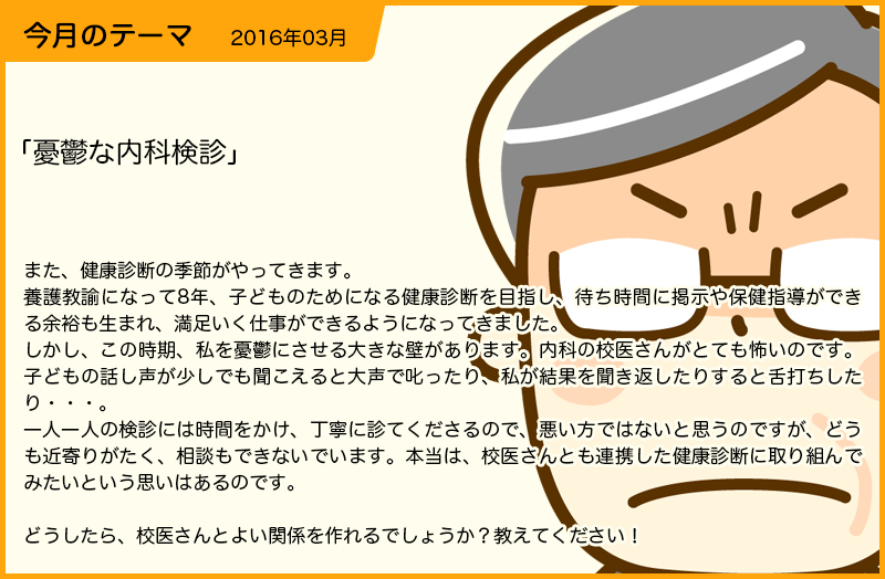 群馬県で養護教諭をしています。年度末で新年度準備に追われる毎日です。 そして、健康診断の季節がやってきますね。私も質問者さんと同じように、気難しい校医さんと出会った経験があります。校医さんのご機嫌を損ねないように時間内に済ませることばかり考えて、担任の先生に子どもたちを静かにさせてほしいとか、クラスとクラスの間をあけないように早めに待機してほしいとかお願いしていたように思います。今思えば、何のための健康診断だったのだろうと考えさせられます。子どもの健康を護るための健康診断なのに、子どもを物のように扱っていたのではないかと。 養護教諭が集まる会議の際に、先輩養護教諭が「普段から校医さんと連絡を取り合っておくのよ!」と話していました。その先輩養護教諭は、年度初めに管理職と学校医まわりをすることや、毎月ほけんだよりを手渡しで届けること、子どもの健康状態など事あるごとに電話連絡をしたりと積極的に関わっていました。まだまだ若かった当時の私は「お忙しいのに御迷惑になるのでは?」と感じていましたが、少しづつ行動を起こすことの重要さを今感じています。校医さんと関わる回数が増えるとコミュニケーションが深まり、色々な相談や世間話もしやすくなります。健康診断に関わる全員が気持ちよく過ごすことができるように、養護教諭が積極的に校医さんと関わることをお薦めします。 |