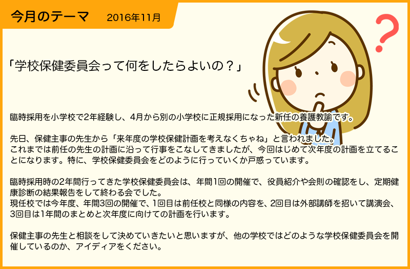 私は小学校に勤めています。現在保健主事をしています。そのため、相談相手がいないというのが悩みです。私は、養護教諭になって20年ですので、自分が保健主事をやることは仕方がないことなんですが、管理職に相談するにしてもまず自分である程度計画を決めてからでないと相談できないですし、まずは、相談できる相手がいることが羨ましいです。 私が年間の計画を考える時に心がけていることは、学校の現状をアセスメントすることです。そして、何が問題なのか、どこに力を入れるべきなのか考えます。そこで、講演の形式をとるべきものなのか、子どもたちが主体的に行う発表形式にするべきなのか、学校医、保護者の出番を作る方が良いのかなどを考えていきます。 過去には、自分自身が講師になって、生活習慣をテーマに授業を行い、保護者にも、子どもと一緒に参加してもらいグループワークを行ったりしました。参加者が少ないのが悩みだったので授業参観日に行い、好評でした。 |