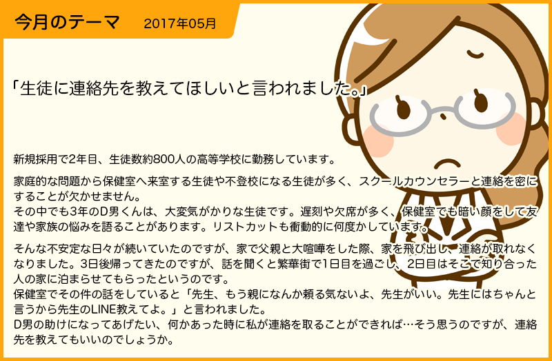 生徒のためならなんでもしてあげたい、そう思うと、困っている生徒がいて、連絡先を教えて欲しいと言われると、教えないと悪いのではないかと思ってしまいますよね。私だったら、どうするかと考えると、まず、自分の勤務上の決まりについて思いをはせます。私の所属する教育委員会では、生徒や保護者との個人的なメールのやりとりは禁止されています。これは不祥事対策です。ですので、まずは個人的な連絡先は教えられない、でも、あなたが嫌いということでなく、決まりであることを伝えると思います。 |