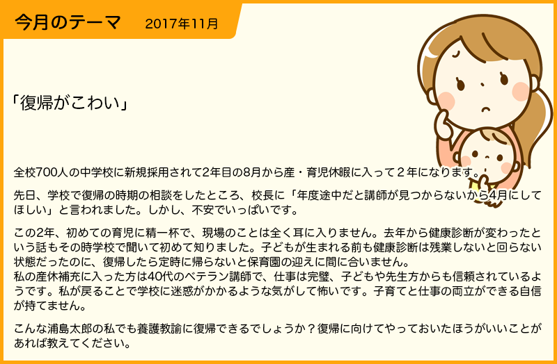 4年前に出産、育休を経て1年半後の4月に復帰しました。現在復帰後3年目の養護教諭です。 まず初めに、今回の事例は当事者の本音をよく反映し、多角的な課題を明確に示す秀逸なものだとは思いますが、ちょっと正直すぎて「意欲も自信も知識も今まで自分の不在時を支えてくださった方への感謝も無いなら、別の道を考えた方が…」と言いたくなってしまいます。復帰しないといけないからする、かのような印象です。視点を変えて、自分のお子さんの学校の養護教諭がこんな気持ちでいる学校に通わせたいと思われるのでしょうか? もちろん子育てにはお金がかかりますから、働かねばならぬということもあるでしょうし、現実にこのようなお考えの方もいらっしゃるのかもしれませんが、それはお心に秘めて頂きたいです。なので、やる気はあるが色々な状況の変化に対する怖さもある、という人だと仮定しますね。 私自身は別の時期に復帰することを考えたこともありますが、結果的には4月復帰しました。希望と、制度と、管理職との相談を踏まえて決まりました。その上で感じたメリットを挙げます。 ・子どもを保育園に入れやすい(というか他の時期では入れない) ・健診は計画時期({emj_ip_}3月)の方が知識や慣れが必要。4月以降はやることがハッキリしている(体はしんどくとも) ・育児部分休業や時短勤務について相談しやすい(私は利用しませんでしたが) ・子どもたちも先生方もメンバーが変わるので色んなことを尋ねやすい 私は育休の間に、何度も現任校を訪ねました。転勤と違い、時間の都合を合わせやすいので平日の落ち着いた時間を狙って伺い、ちょっとずつ引き継ぎをしてもらった形です。ご挨拶も兼ねて子どもを連れて行ったこともありますし、入園予定の保育園の一時保育を利用して子どもは預け、じっくり引き継ぎをしてもらった日もありました。 お住まいの自治体にもよると思いますが、ワーママを支援してくれる施設や相談窓口もあるのではないでしょうか。 子どもを生む前は、私の至らなさ故に若いし頼りないし…という目で見られることもありましたが、出産を経たいまは、自分の子育ての悩みを引き合いに出して生徒と話をしたり保護者の方と話をしたりすることで、深い生徒理解ができるようになったと思います。 とは言っても、復帰前は何もかも不安に思えるときがあるかもしれません。 そのような時は自分の不安や怖さを全部書き出して、一個ずつ相談すべき場所・相手と利用できる制度を調べていくと気持ちも現実も整理されます。 子育ても仕事も一人ではできません。日々実感しています。ここまで頑張った自分も褒めてあげて、そこまで自分を支えてくれた人にも感謝を伝えて、この仕事が好きだという気持ちを取り戻してから復帰されれば、自分の子も学校の子もより愛おしく感じられるのではないでしょうか。 |