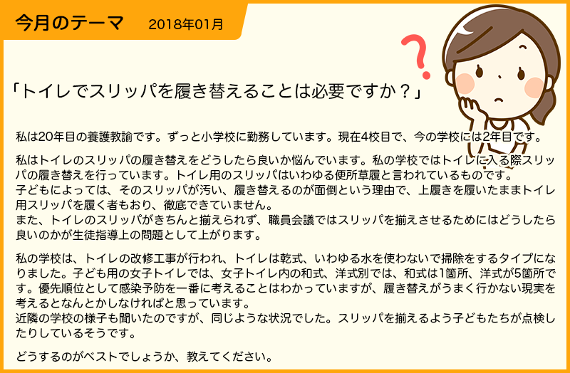 私の学校のトイレも最近改修(乾式)が行われました。学校では、今まで使用していた(改修前のもの)スリッパをそのまま使うという雰囲気だったのですが、私は、スリッパは本当に必要なのかと考え、薬剤師さんに相談しました。薬剤師さんの意見は、乾式で、全部洋式トイレであれば、スリッパがなくても良いだろうが、和式トイレがあるとすると、和式トイレで便器周りに汚染があった場合、上履きにつくことが考えられるので、和式トイレを使う子どもは、上履きのままスリッパを履くタイプのスリッパを使用したらどうかと提案がありました。そこで、本校では、洋式トイレ6に対し、1つ和式トイレがある割合なので、和式のブース前に上履きのまま履くスリッパを置きました。先生たちからは、トイレの入り口にスリッパを並べることがなくなり、すごい楽だと言われました。一番は、感染の防止を考えたのですが、学校という現場では、子供達のしつけもあります。今回は、感染の防止を最優先にしたわけですが、しつけのことで先生たちの負担を解決できたことはラッキーでした。 | [3] | 2018/01/21 11:10 |