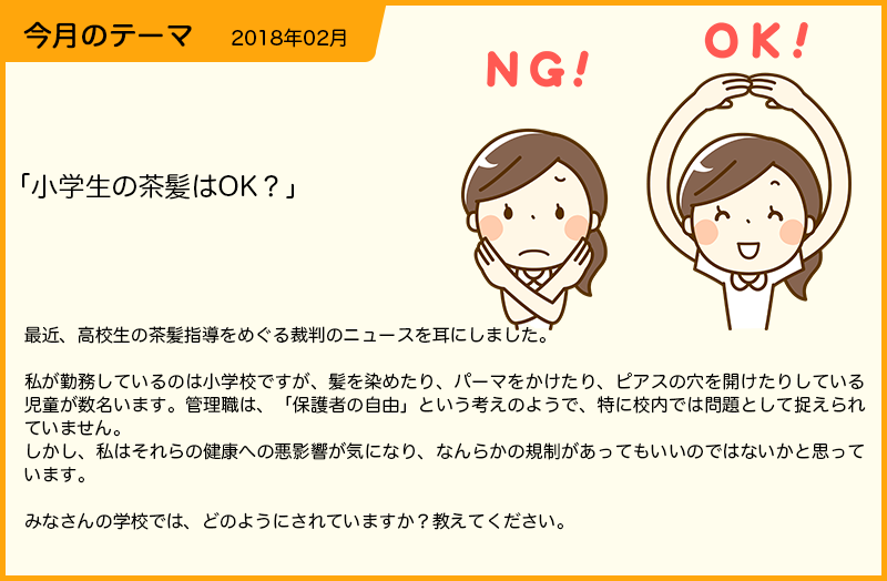 私は小学校に勤めています。小学校では保護者の考えで、茶髪の子どもはいます。私の勤務する小学校では体育の時の服装以外は、学校からの指定はないです。修学旅行や自然教室(宿泊訓練)などの時は、服装の指定はします。それでも修学旅行であれば、小学生らしい服装、自然教室では、動きやすい服装などと伝えますので、解釈は保護者それぞれです。そのため自然教室にロングスカートで参加した子どもいました。教員は、常識の範囲でロングスカートはないだろう、と思っていたわけですが、常識の範囲というのがまた人それぞれなのですね。中学校では、髪の毛の長さや色について規定がありますので、茶髪は禁止されていますが、小学校では禁止を打ち出している学校はないと思います。 健康面でというのは、染める際の化学物質のことだと思いますが、これも、健康面の害を伝えて、保護者に判断してもらうということになると思います。茶髪にしている子どもの保護者も茶髪のことが多いので、健康面を伝えても変化があるかは難しいですが、伝えていくことは大事だと思います。 |