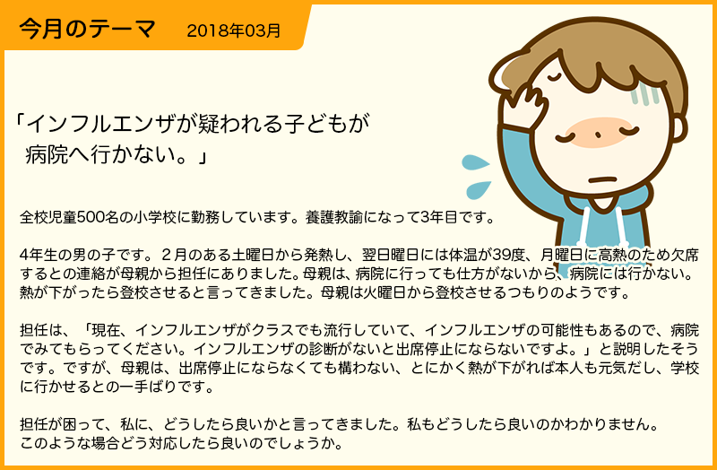 文部科学省によると、インフルエンザの出席停止期間は「発症(発熱)した後5日を経過し、かつ、解熱した後2日を経過するまで」と規定されています。 この子の場合、親は解熱したら翌日登校させるとのこと。しかし、インフルエンザが疑われているわけですから、この時点で規則違反になります。養護教諭は出席停止の意義を話し、「もし明日登校させたいなら、受診して医師の許可(証明書)を得てください」と伝えるべきだと思います。または、月曜日に解熱したとして、もう2日間欠席すれば木曜日には登校できるということにもなります。その時点での証明は必要ないのではないでしょうか。出席停止にするか否かは、終息後に校医と相談して決められると思います。 それでも火曜日に登校してきたら、保健室で隔離し、下校してもらうよう親に連絡します。説得が難しそうなら、校長に出ていただきましょう。 |