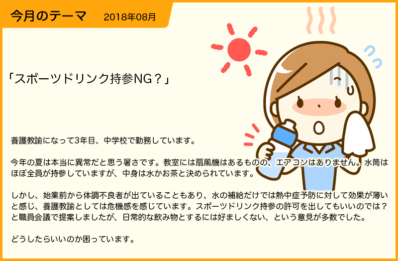 高校で養護教諭をしています。高等学校なので、持参する飲み物は基本的に自由です。この夏は小学生の死亡事例が出るほどの猛暑ですから、何らかの対策は必要だと思います。エアコンが入ればまだ違うのでしょうけれど、それはすぐに何とかなるものでもないでしょうから、できることからどんどん提案していくべきだと思います。周りの養護教諭にも聞いて、周囲の状況を伝えるということも有効かもしれないと思います。 |