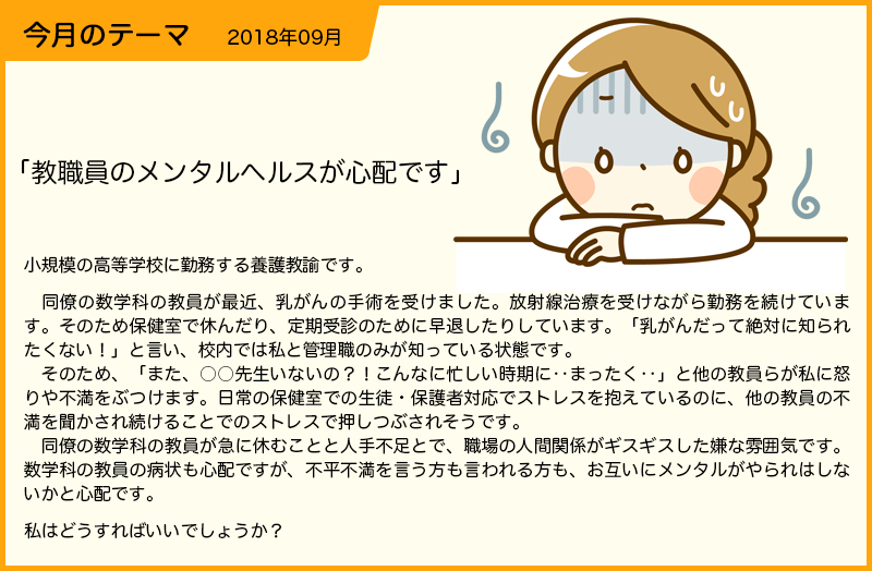 これは「メンタルヘルス」が云々の問題ではなく、職員が病気になったとき、その本人と学校側はどうするかの問題だと思います。A教員(同僚の数学科の教員)は不幸にも乳がんになってしまった。手術後、治療を受けながらの職場復帰を決行したのですね。通常、復帰すると、これまで通り最低ご自分の仕事、校務分掌をこなさなければなりません。病名を知らせないのは個人の自由なのですが、「病気で、今も治療中」ということも内緒で復帰したのでしょうか。結果、復帰後のA教員の勤務はこれまで通りにはいかなかったようですね。これもすべて本人、学校側のあいまいな対応が職員間のトラブルを起こしてしまった原因ではしょうか。 A教員は主治医から勤務復帰の許可を得た上でのことでしょうから、「乳がん(病気)だと絶対知られたくない」のであれば、復帰してもプロとして病気前の勤務状況を維持し、周囲に絶対迷惑をかけないと覚悟すべきです。しかし、実際には周囲に迷惑をかけているわけですから、治療中であること、体調がまだ悪いことを校長、養護教諭、関係職員に詳しく話すべきです。その上で具体的な早退日、休暇日を組むなりし、A教員の体調に支障のないように協力してもらうことです。あとは、教職員という組織の先生方ですから、校長をはじめ、養護教諭もその一助を担えばよいでしょう。 その他、傷病休などの規定のA教員適応性見直しや、職員休養室などの工夫、設置も必要でしょう。また、どんな人でも、いつ何が起こるか分かりません。普段からプロの組織人として協力し合える、良い人間関係を築く努力が大切ですね。 |