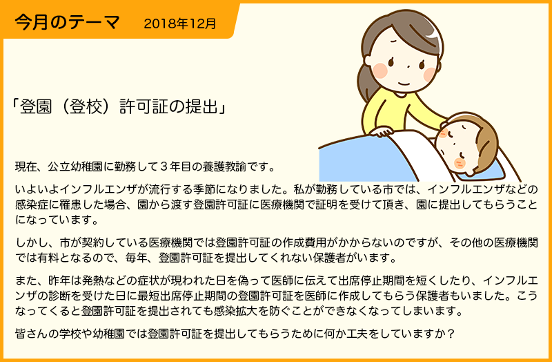 小学校で養護教諭をしています。 本校ではインフルエンザの登校許可書に医師の記載は求めていません。保護者のサインと捺印しか求めていません。医師による記載をお願いするために再度、医療機関に行くことは、治りかけに他の感染症に罹患する恐れがあるのと、保護者にとって負担になるからです。流行期に医療機関に行くことは書類の煩雑化に繋がり医療機関側の負担にもなっている医師に聞きました。 本校のインフルエンザ登校許可書には、発症した日(発熱した日)から、登校して良い日まで、8日間ぐらいのマス目が書いてあり、一日、一日、記入するようになっています。解熱したのが、いつか、そこから2日目はいつか、分かるようにしていますので、相談者さんが困っているような登園禁止期間を短くすることができません。受診した際に見込みで登園許可書を書いてしまうよりは、こちらの方が正確かもしれませんね。 本校ではインフルエンザは医師でなくとも、登校までをカウントできるので証明書は不要という判断ですが、インフルエンザ以外の感染症は「感染する恐れがない」という基準が教員では分からないということで証明書を求めています。がしかし、前任校では、学校感染症のすべてにおいて医師の証明は求めず、保護者のサインと捺印のみでした。 それは、地域の特性にも関係しているかもしれませんので、その地区の教育員会の判断にもよるのかと思います。園長または園の設置者に保護者の実態を相談して「登園許可書」の必要性や意味を再度、確認してもいいかもしれませんね。 |