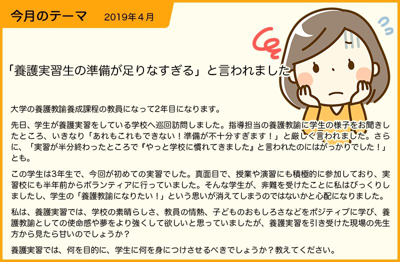 元養護教諭、現在は養護教諭養成大学で教員をしています。大学教員になって8年になり、毎年多くの学生を教育実習に送り出してきました。毎年、実習先の養護教諭の先生方には丁寧に学生指導をいただき感謝しています。 その中で私も同じようなことを経験しています。今回のようなことにならないように、大学と実習校の事前の打ち合わせをする中で、学生のこれまでの学びの状況や実習内容の確認や何のための実習なのかを(実習要項に書かれていますが)明確にお伝えする必要もあるかと思います。私が感じるのは「実習先によって、良くも悪くも学生が変わる」ということです。教育実習に出すのにやや不安な学生であっても実習先で気持ちを高めてくる学生もいますし、逆に何の心配もない優秀な学生であっても実習先でつぶれてくることもあります。つまり、大学の座学では見えにくい学生の資質やコミュニケーション能力などが現場で良くも悪くも出ていると言うことと、受け入れ先の養護教諭の「養護教諭観」や「子ども観」「指導力」が影響するのだと感じています。 大学教員としては、学生が実習先で学校現場を経験することにより「養護教諭として仕事をすることができるかどうかを見極めてきて欲しい」と考えています。実習先では学生の現状を評価いただければと思います。実習先での評価を元に課題を見出し、実習後の学びなおしに役立てていければと考えています。 |