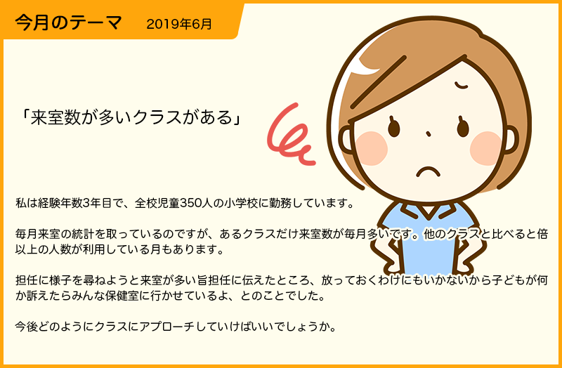 私は、30年間小学校勤務をしていますので、どこの学校でもこのような事例がありました。私は最初、学期末に学級ごとに来室集計を渡していました。が、ある学級では15件、ある学級では、100件超えという実態に悩み、校長に相談したところ、「学級ごと担任に返すのではなく、学年全部を学年主任に渡し、来室状況から児童の共通理解を学年で行ってほしい。」という目的で、学年主任からも来室の判断について話してもらったらどうか、と指導を受けました。そこで、学年主任に事情を話したところ、改めて来室の判断基準を学年会で話し合ってもらうことができました。 | [3] | 2019/07/01 20:51 |