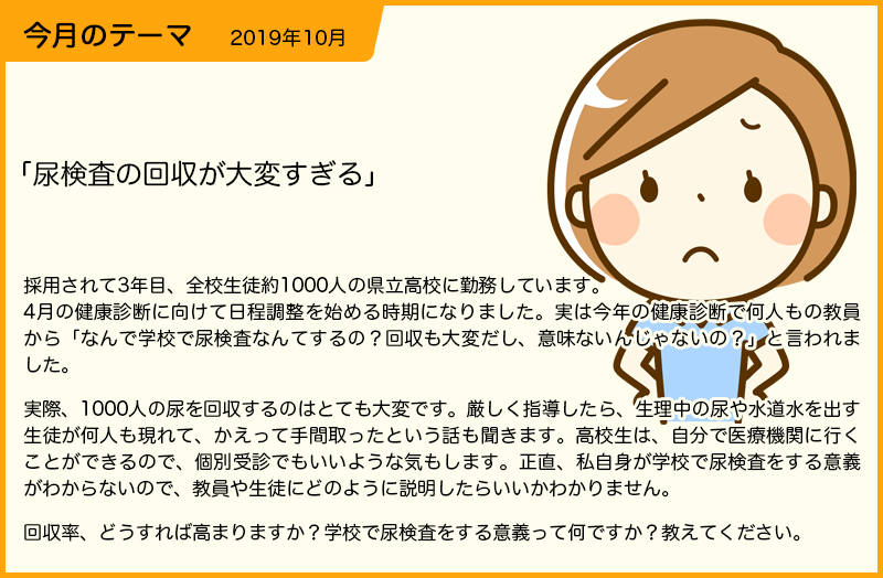 養護教諭を養成している大学教員です。養護教諭の現職時代、尿検査の回収紙袋に学校名や名前のゴム印をひたすら押していたことを思い出しました。今となっては懐かしい思い出ですが、正直なところ「何でこんなに手間がかかるんだろう、面倒だな」と思っていましたね。 現在、大学で健康診断の意義を講義する中で、学生から感想として出てくるのは「健康診断の色々な検査が、何のために行っていたかをしっかり分かっていたら、もっとちゃんと健康診断を受けていたのに」や「毎年なんとなく、受けなくちゃいけないから受けていたけど、意味があったんですね」、「恥ずかしかったり、面倒だと思っていたけど、自分のからだを知るために大切なことなんですね」と、養護教諭を目指す学生でもこのような反応があります。つまり、検査の意義や、必要性、どんな病気が見つかるのかなど、指導・教育することで回収率が上がったりするのではないかと感じます。しかも、自己負担なく毎年検査が行われるわけですからね。面倒でも、子どもの健康をを守るために指導・教育をがんばってほしいです。 |