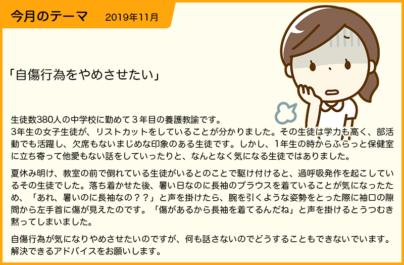 【SLIPERより】 自傷行為を発見し、やめさせたいと考えられているのですね。自傷行為研究の権威である「国立研究開発法人国立精神・神経医療研究センター」の松本俊彦先生は「①自傷行為の援助において最も重要なのは、自傷行為をやめさせることではなく、自傷行為の背後にある若者たちの困難な問題を見極め、それを軽減することにある1)」、さらに「②こうした援助プロセスを通じて世の中には信頼できる人もいて、つらいときには助けを求めてもいいことを知ってもらうこと1)」と述べています。したがって、養護教諭として①自傷行為自体をやめさせるのではなく、自傷行為の背後にある問題を軽減することおよび②援助を求めやすくすることが大切です。 自傷行為は単に自分の身体を傷つける行為だけでなく、自傷後に傷の手当てをしないことも含めた概念と考えられています1)。また、典型的な自傷行為は一人きりの状況で行われ、周囲の誰にも告白されない傾向があり、「人の気を引くためのアピール的行動」とは異なり、「孤独な対処行動」と理解すべきであるのです1)。自傷行為は自殺とは峻別される行為である一方、自傷行為を繰り返す者の自殺リスクは高く、長い時間をかけて様々な自己破壊的行動を発展させながら最終的に自殺既遂へと至る事例もあると松本1)は述べています。つまり、養護教諭としては、自傷行為は、その子の将来の自殺リスク因子として捉え対応することも必要なのです。 これらのことから、「何も話さないのでどうすることもできない」と相談者さんは頭を抱えているようですが、まずは担任や部活動顧問等に最近の様子や家庭環境等を聞いてみましょう。中学校3年生ということなので、部活動の引退や高校受験が関係しているかもしれません。要因となる情報を周囲の者から収集してみましょう。それと同時に、本人にも、いつから自傷行為をするようになったのか、自傷行為をしてしまうのはどんな時だったか、きっかけや、そのときの感情を尋ねてみましょう。一度きりの声掛けでは話さないかもしれません。「何か困っていることない?あなたを守りたいので話して欲しい」と気持ちを伝え、心の痛みを自分の言葉で表現できるように言葉掛けしていくことが大切です1)。また、いつでも保健室に来て良いことを伝え、手当てを求めてきた場合は、「自分を大事にしたい気持ちがある」と理解し、「よく来たね」と言葉掛けすることも大切です1)。生徒が自分のことを告白したら、丁寧に何か辛いことがあったのかを聞き、問題を解決したり軽減する援助を考え、辛さを乗り越えるために自傷行為よりも健康的な別の対処法を一緒に考える必要もあると松本1)は述べています。自傷行為は、同じように苦しんでいる若者には驚くほど簡単に伝染するため、自傷創が他の生徒の目に触れない工夫も必要です1)。 ケースマネジメントのスキルラダーにあるように、学校体制を整え役割分担すること、多職種と連携しケース会議を行うなど、改善に向けて養護教諭がマネジメントすることが大切です。 自傷行為については、「国立研究開発法人国立精神・神経医療研究センター」ホームページ:https://www.ncnp.go.jp/general/books_12.html (2025.3.30)に参考になる文献が掲載されています。まずは、養護教諭自身が、子どもたちを守って行くために自傷行為を行う子どもの心理状態や背景、援助の方法を理解する努力をしていきましょう。 1)松本俊彦 自傷行為の理解と援助 精神経誌114巻8号 2012 |