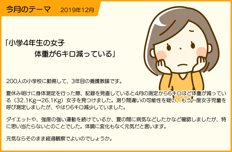 【SLIPERより】 身体測定の後に前回の記録と照らし合わせて、体重が減少していないかチェックしているというのは、身体測定の事後措置として大切なことができていますね。 さて、今回はその上で体重が6Kg減少しているのを確認したとのことです。育ち盛りの小学生という時期にこれだけの体重減少があるのに、経過観察だけでは対応が足りないと言えるでしょう。学校保健安全法第14条では、『学校においては、前条の健康診断の結果に基づき、疾病の予防処置を行い、又は治療を指示し、並びに運動及び作業の軽減をする等適切な措置をとらなければならない』とあり、基準として、3 必要な検査、予防接種等を受けるよう指示すること。9 その他発育、健康状態等に応じて適当な保健指導を行うこと、とあります。 具体的な対応の流れとしては、思考→養護教諭ができる対応→校内でできる対応→校外との連携ということになるのではないでしょうか。 ですからこの場合、体重が減少する病気(小児糖尿病、Ⅰ型糖尿病、バセドウ氏病、甲状腺機能亢進症など)の可能性や、虐待・ネグレクトの可能性はないか(家庭環境・経済状況(就学援助の有無))を想定・確認をします。その上で、成長曲線の活用、定期的な個別の体重測定の実施や、食生活・睡眠・休養等についての個別指導の実施を計画、担任や管理職等関係者と情報共有、さらに、保護者とも連携をとり、最近の児童の様子を聞いてみましょう。児童本人も忘れていたり、意識していなかったりする情報が得られることがあります。加えて学校医に相談、医療機関へ受診のおすすめをすることも必要ですね。スクールカウンセラーやスクールソーシャルワーカーに繋ぐことが適切な場合もあるでしょう。継続した管理が必要になった場合は個別の取り組みプランを作成し、学校全体で対応内容を共通理解し、組織で対応することが重要1)になります。 1)文部科学省スポーツ・青少年局学校健康教育課監修 児童生徒等の健康診断マニュアル 2015 |