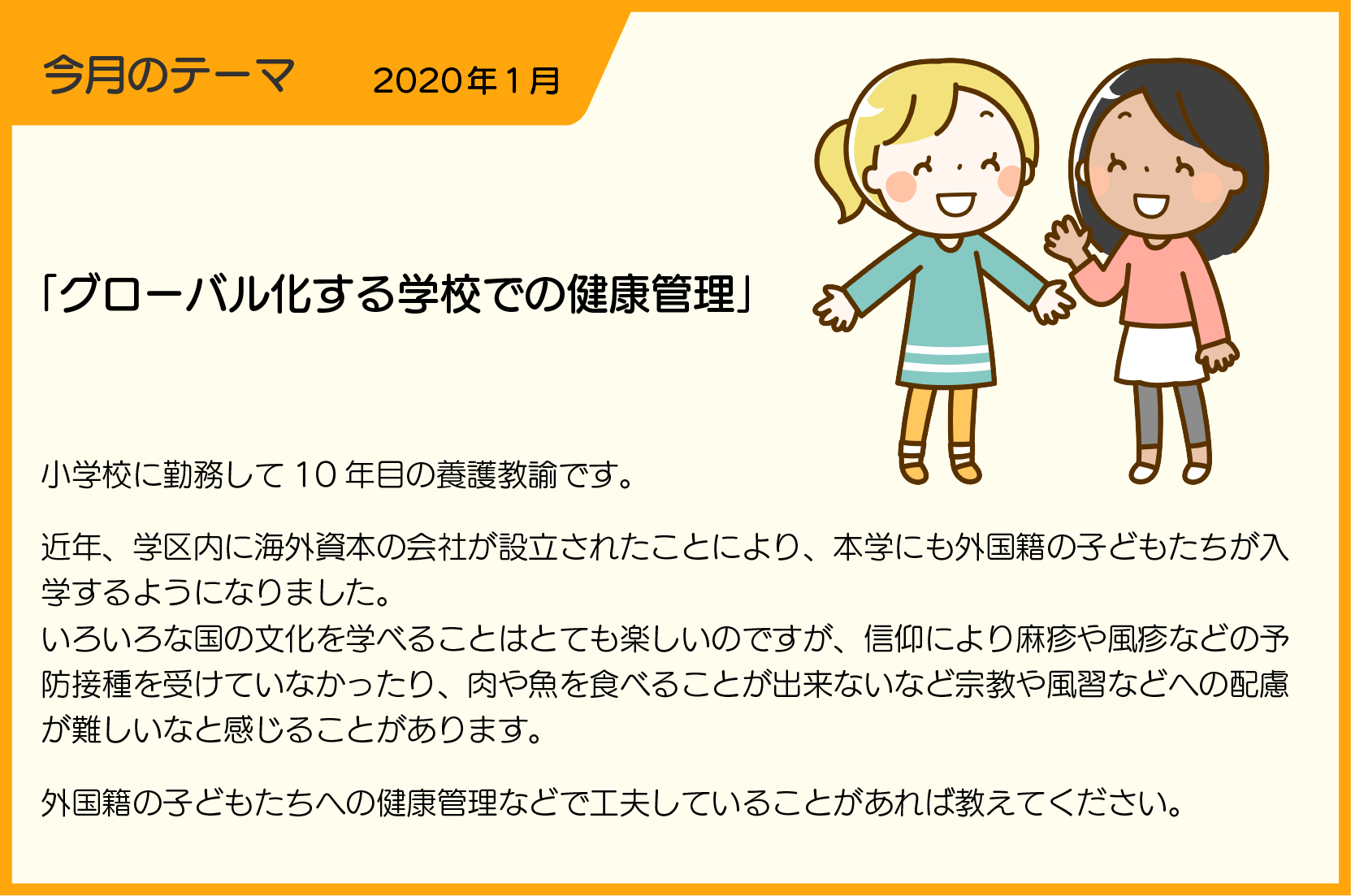 私が勤務する校区には海外資本の会社があるわけではないのですが、アメリカ人宣教師の家族が住んでおり、中学生の息子が中学校に通ってきています。英語の授業では、授業は受けず(ネイティブなので必要ない)、一旦自宅に帰ります。また給食も食べない(給食も好みではない)ので、一旦自宅に帰ります。弁当を持参するという考えはありません。修学旅行は、京都だったのですが、神社、寺には行かない、とのことで、途中の旅程で一人で新幹線で帰宅しました。自己主張がしっかりしているので、日本の学校に合わせるという考えがあまりないと感じました。合理的というのかもしれません。自分たちに必要か、必要でないかで考えるというスタンスです。そのため、よく話し合いをして、対応を考えていますが、学校としては、「みんなと同じにしてほしい」と伝えることがすでに「なぜ」と言われてしまうので、保護者の希望に対応できるものは対応しようという方針です。健康管理という意味では特別に何かしたということはないですが、これから、いろいろな国の子供が増えると、対応も多様化するだろうなと予感しています。 |