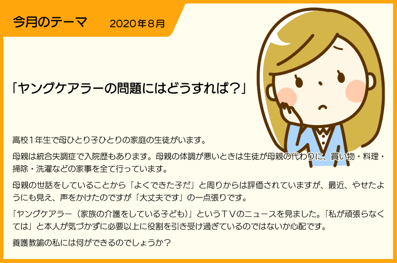 1番目の投稿者の方のご意見同様、保健室にいつでも来ていいよ、というメッセージを伝えるのとともに、やはり、スクールカウンセラーやスクールソーシャルワーカーにもつないでいってあげることが必要かなと思います。私もヤングケアラーの生徒に接した経験がありますが、気丈に振る舞っているように見えて、やはり親の病状にかなり左右されてしまうので、時にショックを受けたり、帰りたくないと言っていました。養護教諭だけでなんとかしようと思わず、校内だけでなく、場合によっては校外の組織とも協力して支援しなくてはならないと思います。 | [1] | 2020/08/22 08:42 |