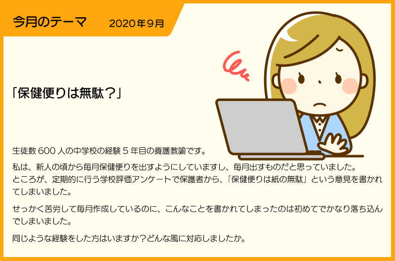 【SLIPERより】 毎月発行していた保健便りが紙の無駄と言われてしまっては、落ち込んでしまいますね。しかし、なぜ無駄と言われてしまったのでしょうか。内容に問題があるのか、その発行頻度に問題があるのか、紙資源の問題か…。 ピンチはチャンスと捉えて、保健便りについてもう一度振り返って考えてみませんか。 ポイント1<読んでもらうための工夫を考えよう> ① ターゲットは誰ですか あなたの保健便りは、誰を対象にしていますか?児童・生徒ですか?保護者ですか?ターゲットをはっきりさせるとより、伝えたい相手に届く保健便りになります。また、児童・生徒がターゲットであれば、内容が発達の段階にあっているか確認しましょう。配付時には担任に重要なポイントを説明してもらいながら配付するなどしてもいいですね。 ② 身近な内容・親近感の湧く内容を取り入れて 例えば、学校独自のタイトル設定(例:○小げんきだより、○中ヘルスニュースなど)や、学校独自の内容を心掛けていますか。養護教諭の専門性を生かした啓発記事はもちろんですが、それに加えて学校全体の様子や保健室の様子が保健便りから垣間見られるような内容にするとよいでしょう。保健行事の報告や健康意識などについて教員や児童生徒にインタビューしてみたり、保護者からいただいた行事の感想などを掲載したりしてみてはどうでしょうか。 ポイント2<毎月発行することの必要性を考えよう> 当たり前のように毎月保健便りを発行しているとのことですが、そもそも毎月発行するのが当たり前なのでしょうか。場合によっては発行しない月、複数回発行する月などいろいろあってよいのかもしれません。伝えたい内容や学校の実態に合わせて検討しましょう。 ポイント3<紙で発行することの意味を考えよう> 学校から配付される紙が多すぎるとはよく言われることです。紙を使った便りを全員に配付することが必要な場合ももちろんあると思います。しかし、どのように活用してもらいたいから紙なのか考えてみてもいいかもしれません。紙媒体でなくても、学校ホームページでの掲載や保護者のメーリングリストに添付ファイルで毎月送るなど他の方法も検討の余地があるかもしれません。 保健便りは誰のものでしょうか。発行すること自体が目的になっていたり、養護教諭の自己満足になったりしていないか、原点に立ち戻って点検してみることも必要ですね。その上で、養護教諭自身が児童・生徒の反応をイメージしながら、ワクワクした気持ちで作成することができるといいですね。 |