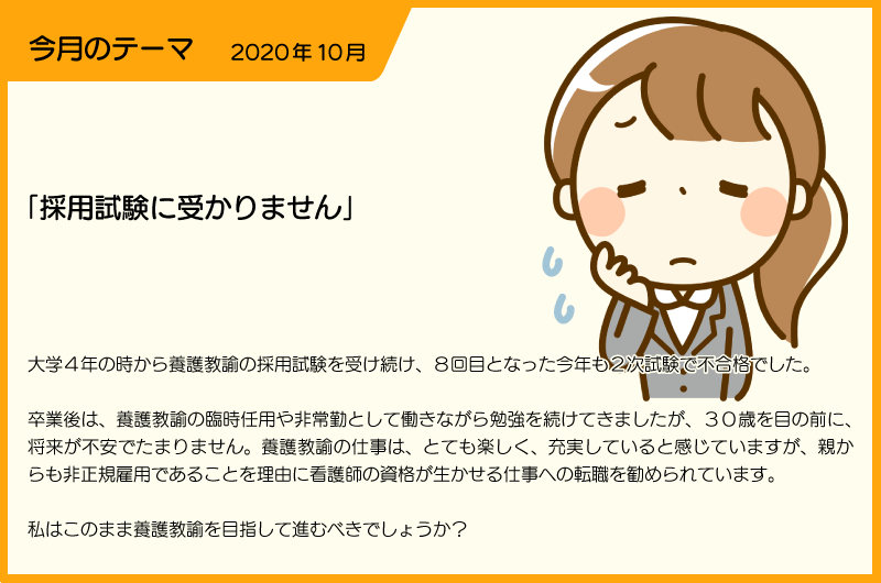 私は8回受け,そのうち2次試験にも2回落ちています。2次試験で不合格となると何がいけなかったのだろう…と自分自身を否定されたような気持ちになってしまったことを思い出しました。自分の人生がなかなか進まないような感じがして落ち込んだこともありました。 でも,一次試験に合格しているということは,合格はもうすぐだと思います。2次試験の対策はどのようにされていますか?面接の他に実技や授業はあるのでしょうか?一次試験に合格しているということは「必要な知識は身に着けていると判断された」ということだと思います。勉強の仕方も「こうやれば合格できるのか」と手ごたえをつかまれたのではないでしょうか。二次試験は「必要な知識は身に着けていると判断された人」の集まりで,どんぐりの背比べ状態だと思います。私はその中で,他の受験者よりも圧倒的な経験を持っているということぐらいしか秀でているものがなかったように思います。そして,もう絶対に後戻りはできない,という気持ちを強く持つこと,自分に自信を持つことも大切なのかなと感じました。勤務時間以外の時間,日常生活のほとんどすべてを試験勉強に使ったくらい,集中して取り組みました。 私も看護師の資格を持っており,早い友達はすでに主任や師長などの役職に就いている人もいます。親からも収入や雇用が安定している看護師として働くことを何度も勧められました。でも,頑張ってよかったと思っています。 3回目の採用試験の時「8回目ですか。今年度も落ちたらどうしますか?」と聞かれました。すぐ「来年度も,合格するまで受験し続けます」と答えました。覚悟が求められていると感じました。 逆にずっと講師という道もあると思います。結婚や出産をされ,その後は話が来たときに気楽にやっているという友人もいます。そのうち,私立からお誘いが来る人もいます。考え方次第だと思います。 私はこの相談をされた方だったら,きっと頑張れるとおもいました。まず,今年度2次試験まで頑張った自分を認めて,できたところを認めて欲しいなと思います。30歳は確かに節目ではありますが,まだチャレンジできると個人的には思います。相談された方のお名前もわかりませんが,どのような選択をされても応援しています。 |