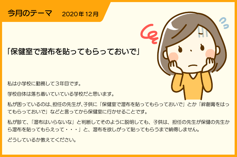 小学校ではよくある話ですね。私も若いときは「人に指図して!」なんてピリピリしたこともありましたが、しばらくしてからは全く気にならなくなりました。子どもが保健室に来てくれることは何でもOK。どんなことでもうまく対応できる自信がついてきたからです。 ようするに、子どもと担任の性格や状況をよく理解していれば、その場で適切な処置ができます。この場合「そうか、担任の先生がそう言ったのね。私はシップ貼らなくてもいいと思うけど、あなたは貼ってほしい?」でいいと思います。そこで、シップを貼ってあげながらその子の話を聞いてあげる。担任に何か問題がありそうなら後で話をする、です。 小学生は保健室へは、何か身体的な理由がないと行けないと思っているので、「紙で指を切った」などと、よく見てもわからないようなものでも保健室にやってきますよね。そんな時、私はその子と話をしながら、大げさに消毒して絆創膏や包帯をしてあげたこともありました。 |