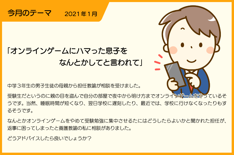 これは家庭内の問題であって、学校がどうするかということではないと思います。学校としてはオンラインを利用した授業を取り入れたり、生徒にスマホやタブレットなどの持ち込みを許しているところもあるでしょうが、学校内でゲームを自由にやらせるようなことはないでしょう。それと同様、家庭内でもそれぞれの教育方針やしつけのようなものがあるはずですし、中3の受験生ならば自分でコントロールもできる歳ごろのはずです。このケースの場合も、親が担任に相談した際に「ご家庭で解決することなので頑張ってください」でいいと思います。 しかし、受験勉強に集中できない原因が「いじめ」など、学校に関係するものだとしたら話は別です。また担任が養護教諭に相談したのは、何か身体、精神的な問題を抱えているケースかもしれません。それらの確認は養護教諭ができます。もし、気になることがあったら、その生徒や親に詳しい事情を聞いて、学校での相談体制をコーディネートすることもできるでしょう。 |