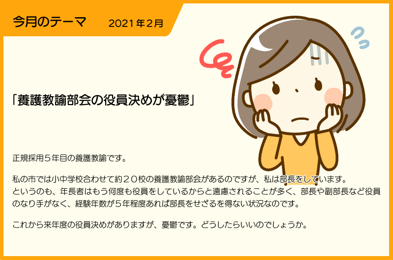 【SLIPERより】 それぞれの学校や個人の事情があるので、無理に役員を押し付けるわけにもいかないですから、大変さがうかがえますね。 なり手がない理由として考えられることは、負担感がある割にメリットが少ないということが挙げられるでしょう。それを解決する方法を考えてみましょう。 ① 負担感を減らす 役員の行っている仕事を精査し、マニュアル化したり、他に割り振ることができないか検討してみましょう。また役職によっては人数を増やすことで一人の負担を減らしたり、経験年数が少なくても担当できる係があったりするかもしれません。加えて、前年度部長に監事や相談役として役員会に残ってもらうことで、部長の負担感が軽減されるかもしれませんね。 ② メリット(報酬) 学校では、金銭的な報酬を支払うことは難しいと思いますので、何らかの形で、養護教諭部会から感謝の気持ちを伝えられるような場を持てるといいのではないでしょうか。さらに、役員になることで新しい人や物、知識との出会いがあるなどの利点があります。それらを前向きに捉えてもらうことができれば、メリットの一つとなり得るでしょう。 その他に、立候補者を募る、推薦してもらう、公平にくじ引きをする、輪番制にするなどの方法が考えられますが、部長は、教育委員会とやり取りする機会もあるでしょうから、くじ引きや輪番制で決めるのは不適切かもしれません。しかし役によっては、この方法での選出を検討できるかもしれませんね。 また、一人で役員選出の重荷を背負わないようにしたいですね。さらに、選出された方には協力するということを共通理解しておきましょう。これまでのことや部員のことなど全体のことをよく知っている先生からアドバイスをいただくことも大切です。 以上のことを踏まえた上で、まずは、役員決めについて困っていることを改めて養護教諭部会で話し合ってみることから始めるのが望ましいのではないでしょうか。 |