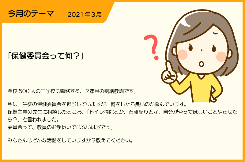 相談者さん、あなたが中学生(または高校生)だった頃、生徒の保健委員会はどのような活動をしていましたか? または、教育実習先の学校ではどのような活動をさせていましたか? 思い出してみましょう。 そして、現在の勤務校の前任者である養護教諭はどんな活動をさせていましたか?前任者や周りの教員に聞いてみましょう。 何かひとつでも良い(良かった)と思う活動はありませんか? あれば、それを真似るところから実践してみませんか。 残念ながら「教員のお手伝い」ばかりで、あなたが理想とする「してみたい活動」はありませんでしたか。 話が逸れますが、ご質問にあった保健主事の先生はトイレ掃除や石鹸配りが養護教諭のさせたい仕事(つまり養護教諭の仕事) だと認識しているのでしょうか? それに少々疑問ですが、今回は「他校の実践例が知りたい」というご相談だとして、 なかったら、あなたが探すしかありません。 まずは足元から、近隣校の養護教諭や同期の養護教諭らに保健委員会の具体的な活動内容をたずねてみましょう。 同じ地域や同じような学校規模の方が真似しやすく、参考となる実践例が多いかもしれません。 そして良い実践例は養護教諭が購読する雑誌の掲載から探すことも出来ます。学校の連絡先も書いてあるはずです。 とにかく、あなたが動かないと何も始まらないかもしれませんよ。 |