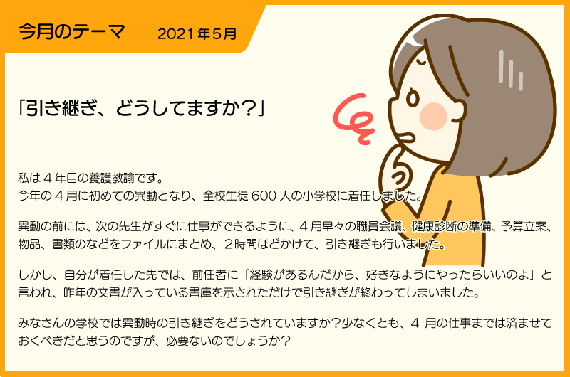 私は養護教諭になって8年目で、現在は私立校に勤め5年目になります。 これまでに3回異動しましたが、きちんと引継ぎをしてくれた人もいれば、そうでない人もいました。 特に困ったのが、現任校に着任した時です。 前任の方は片付けや整理整頓が苦手だったらしく、書類は乱雑に置かれ、救急セットの中もごちゃごちゃで、保健室が荒れていました。 そのような状態で、私が着任するよりも前に退職されたので、当然引継ぎもほとんどなく… 健康診断の進め方一つでも、いつ、どのように校医や業者に連絡するのかが全く分からず、最初の一年は本当に苦労しました。 そんな経験から、私は一年の仕事の流れをまとめた執務の手引きを作り、いつでも引き継げるようにしています。 もし、一人職の養護教諭が突然、長期にわたって休むことになっても、この手引きを見れば執務の内容が分かるように… 学校全体のためにも、引継ぎはきちんとするべきだと思います。 |