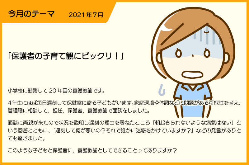 【SLIPERより】 近年、仕事や家庭環境など保護者の背景が様々になり、教育や子育てに関する考え方も多様化しています。 しかし、日本では日本国憲法で「すべて国民は、法律の定めるところにより、その保護する子女に普通教育を受けさせる義務を負ふ」、教育基本法で「国民は、その保護する子に、別に法律で定めるところにより、普通教育を受けさせる義務を負う」と規定されていて、保護者は子どもに教育を受けさせる義務があります。 近年、不登校に対するフリースクールや自ら望んで義務教育を受けない子どもなど多様な考え方に応じた教育がみられるようになってきました。このような多様性を認めることは大切ですが、学校で他の子どもたちと一緒に教育を受ける以上、最低限の生活習慣を身に付けることや集団としてのルールを守ることは必要です。 書き込みにもありましたが、まずはこの子が毎日保健室に来る理由を「服装」「表情」「体重の増減」などから丁寧に探ってみてはどうでしょうか?保護者は「朝起きられない病気はない」と言っていますが、遅刻の理由が単なる生活リズムの乱れではなく、家族関係や家庭環境など相談しにくい理由なのかもしれません。また、担任やクラスメイトに教室での様子や休み時間の過ごし方などを聞いてみると、保健室では気が付かなかったこの子の様子を知ることが出来ると思います。 多様な観点からアセスメントしてみると、本人も気づいていない健康上の問題や虐待などの他の理由が見つかるかもしれません。そして、これらのアセスメントを基に本人に「自分はどうしたいのか?」を丁寧に聞き取り、その解決策を一緒に考えていくことが、毎朝保健室に寄ってくれる子どもに対して養護教諭ができる支援になると思います。 |