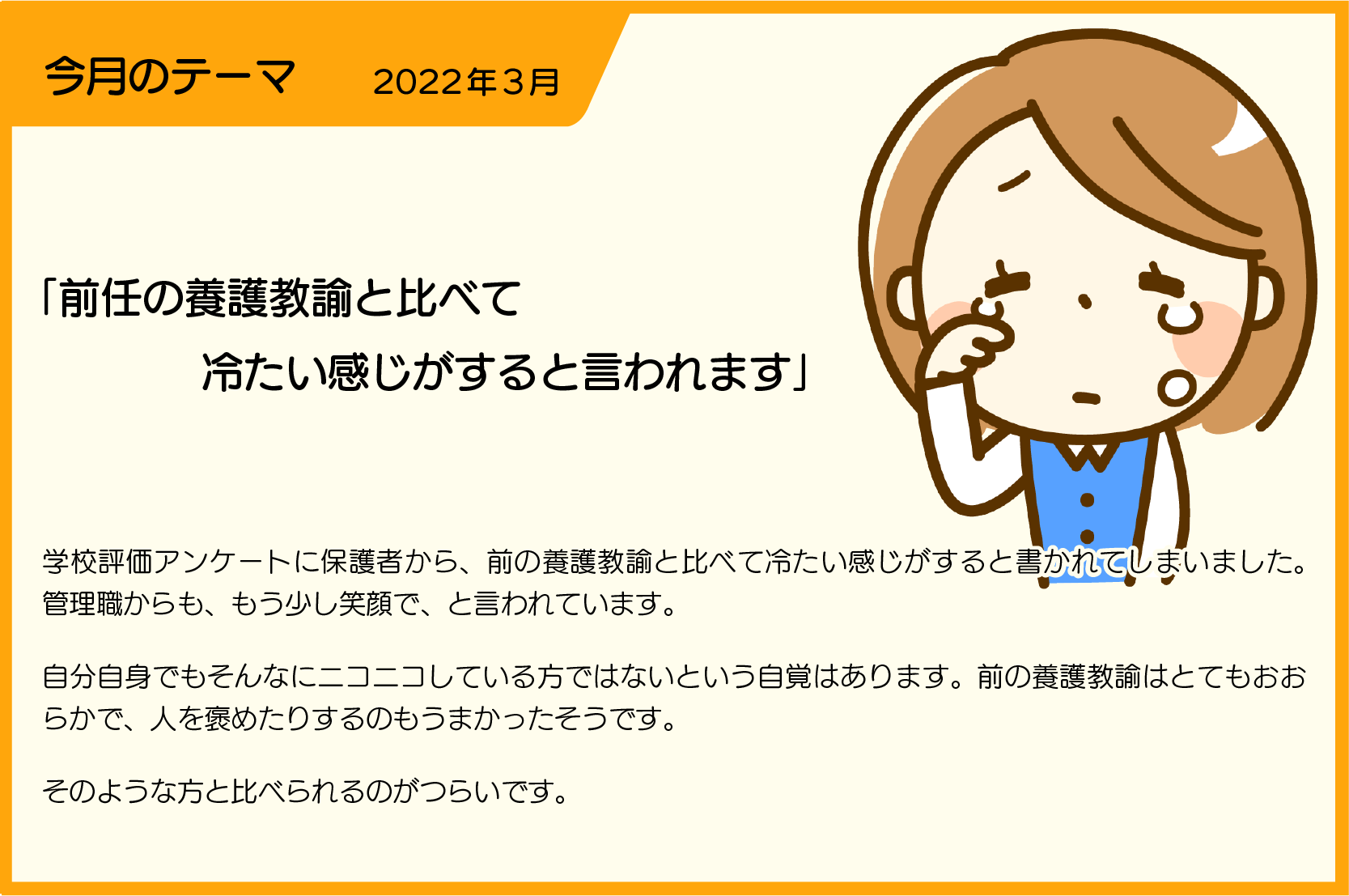 まずは、学校評価アンケートで保護者が書いた内容です。「冷たい感じがする」それも前任の養護教諭に比較してと。あなたが職務怠慢をしているならともかく、性格や外観を前任と比較してとやかく言うのは学校評価ではないと思います。他の投稿者の言われるように、養護教諭としてやるべきことをしていれば気にすることないです。 人は親や先生を選ぶことはできないですし、生きていくためにいろいろな人と接し、試練を受けながら、それを乗り越えて成長していくものです。特に日本人は周囲の人と深くかかわりあいながら生きていますので、このような悩みは多いでしょうね。アメリカでは近所でも職場でも自分自身のやり方で周囲を気にせず勝手に生きているように見えます。困ってもだれも助けてくれないので自分が頑張るしかない。少しでもあやかりたいですね。 | [4] | 2022/04/01 14:06 |