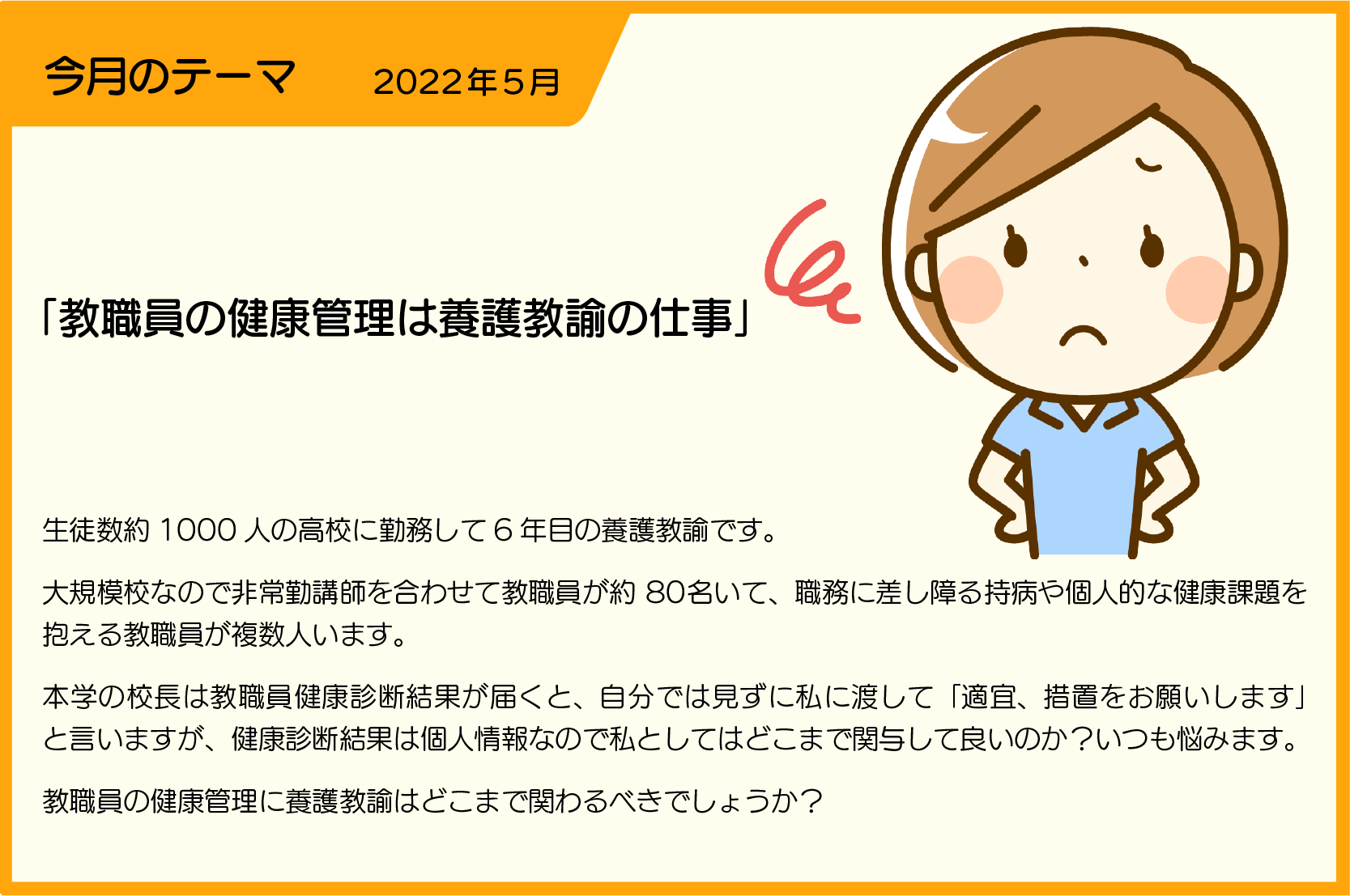 【SLIPERより】 日本では常時50人以上の労働者がいるすべての職場で産業医と衛生管理者を、10人以上50人未満の場合は安全衛生推進者もしくは衛生推進者を配置することが労働安全衛生法において定められています。 この法律に従うと学校で養護教諭が衛生管理者を担っていない場合、原則的には教職員の健康管理を担当する必要はありません(教えて達人2015年12月「私、衛生管理者だったの」参照) そして、学校保健安全法15条に 1 学校の設置者は、毎学年定期に、学校の職員の健康診断を行わなければならない。 2 学校の設置者は、必要があるときは、臨時に、学校の職員の健康診断を行うものとする。 同16条に「学校の設置者は、前条の健康診断の結果に基づき、治療を指示し、及び勤務を軽減する等適切な措置をとらなければならない」、学校保健安全法施行規則16条に「法第15条第1項の健康診断に当たった医師は、健康に異常があると認めた職員については、検査の結果を総合し、かつ、その職員の職務内容及び勤務の強度を考慮して、別表第2に定める生活規制の面及び医療の面の区分を組み合わせて指導区分を決定するものとする」と明記されており、養護教諭が職員の健康管理を行う法的根拠や責務は厳密にいうとありません。 しかし、皆さんからのコメントにあるように、養護教諭が衛生管理者になっていなくても、職務上、教職員の健康診断結果を管理している学校が多いようです。そこで、養護教諭が衛生管理者ではない場合は上記の法令等による根拠を校長に確認していただき、教職員の健康診断結果の取り扱いを検討するのはどうでしょうか? そして、校長から「教職員の健康管理について個人的に相談に乗って欲しい」というような依頼を受けた場合は、養護教諭が窓口になることもあるのだと思います。 しかし、近年、学校における健康相談の多様性が報告されており、2014年度に実施された日本学校保健会「養護教諭の職務に関する調査」によると、教職員自身に関する相談を受けたことがある養護教諭は幼稚園65.3%、小学校73.5%、中学校78.8%、高等学校79.2%、特別支援学校86.6%います。また、文部科学省の「現代的健康課題を抱える子供たちへの支援~養護教諭の役割を中心として」では、養護教諭は「誰でも(児童生徒、保護者、教職員等)いつでも相談できる保健室経営を行う役割を担う」と記されていて、このような保健室経営を行うことで健康課題を抱える教職員の含めた対象者を把握することができると述べられています。 健康診断後の措置や教職員からの健康相談については、持病や健康問題の内容にもよりますが、相談内容が職務に影響するようであれば衛生管理者や管理職にも報告する必要があることを相談者に伝えて、対応を行うのが良いと考えます。 |
