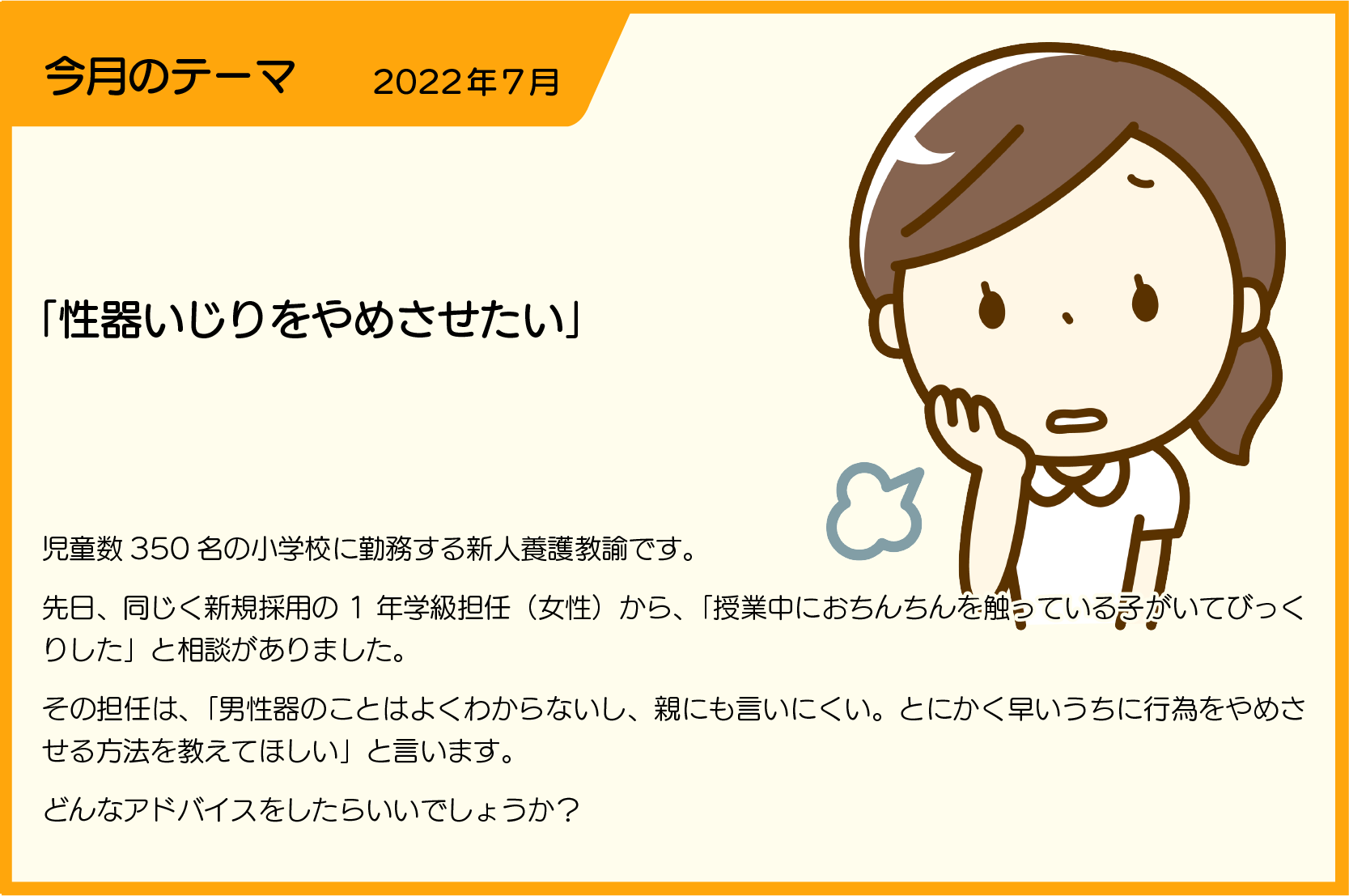 私は養護教諭歴20年ですが、同じように相談された経験があります。 まずは、亀頭包皮炎や湿疹などがないかどうか確認する必要があると思います。かゆみや痛みで触っているのであれば、小児科や皮膚科などを受診し、治るものなので一時的なものです。確認すると言っても、養護教諭だからと言って性器をみるわけには行きませんから、保護者に掻いていたことを伝えて、確認してもらうようにするといいと思います。 一番良くないのは、頭ごなしにしかることだと思います。かゆみや痛みでない場合は、どういう子どもなのか、どういう家庭なのかを把握してから、やめさせる作戦を立てたほうがよいと思います。早いうちにやめさせるためにも、その行為にだけ目を向けるのではなく、本人がその行為をする背景を探ったほうが良いと思います。 |