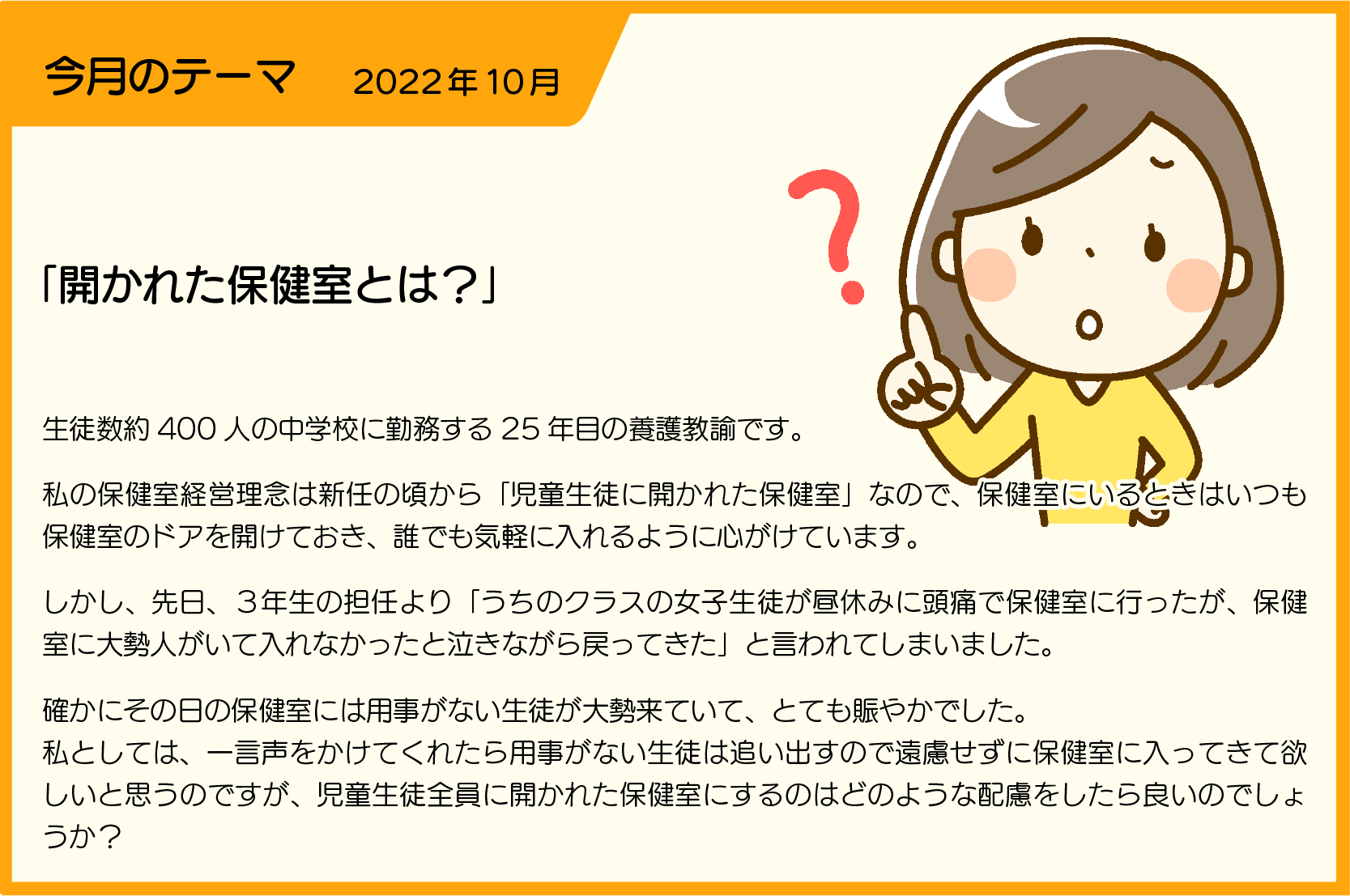 開かれた保健室と言うとき、誰にとっての「開かれた」なのかを考えてほしいと思います。大勢毎日保健室に来室しているというとき、大概同じようなメンバーが来室していたりします。そのメンバーは保健室をどのように必要としているのか、本当に保健室でなくてはならないのか、用事はないのにたまり場となっているだけでなはいか、養護教諭がその辺を見極めることが必要ではないでしょうか。保健室を利用したくても心や体が弱っているとき、たった一言の声をかけられないときがあると思います。そんな児童生徒のために保健室は開かれたものでありたいのではないでしょうか。保健室利用のルール作りを全校に徹底することが大切だと思います。だからと言って厳格なルールで縛って、誰も行きたくなくなるような保健室では意味がありませんから、学校の規模によってのルールを作成し、自ら校内を回って声がけをしたり、保健室のあたたかな雰囲気作りをしていくことも大事なことだと思います。 | [2] | 2022/10/17 13:29 |