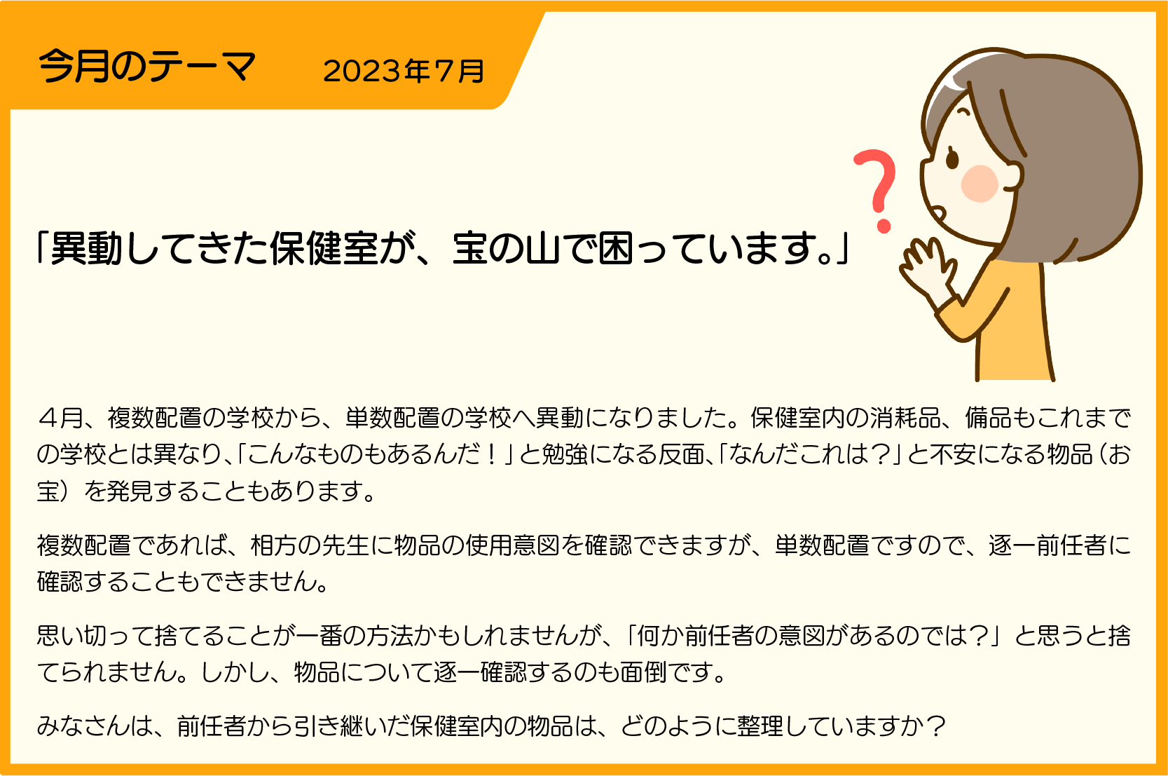 【SLIPERより】 ・不要品が多く存在すると、業務のモチベーションや保健室の使い勝手にも影響が出そうですね。 ・基本的に現養護教諭が「使わない!」、と判断したものは思い切って廃棄しても良いと思います。 ・どうしても判断に迷う場合は、1年様子を見て廃棄するかどうかを決めてもいいかもしれません。 ・備品は、学校で管理しているものであり、勝手に捨てることはできません。 ・事務職員に、廃棄費用や廃棄の方法などを確認しましょう。 ・ちなみに「昭和61年4月1日文体保第105号文部省体育局通達」に、保健室に備えるべき物品が示されています。 ・しかし、内容的には時代の移り変わりで、現在使用されていないものも多く、学校の実態や現在のエビデンスに基づいて精選する必要があります。 ・保健室が綺麗だと、子どもも大人も、そして養護教諭自身も保健室を活用しやすくなり、雰囲気や指導などにも良い方向に向かうかもしれません。 ・将来、自分自身が異動後も、同様の心配事が起こりうるかもしれません。 ・日々保健室内の整理整頓に努め、気持ち良く保健室の受け渡しができるよう、気をつけていきたいですね。 ・2021年5月の投稿もご参考ください。http://b.ibbs.info/sliper202105/(引き継ぎについて) |