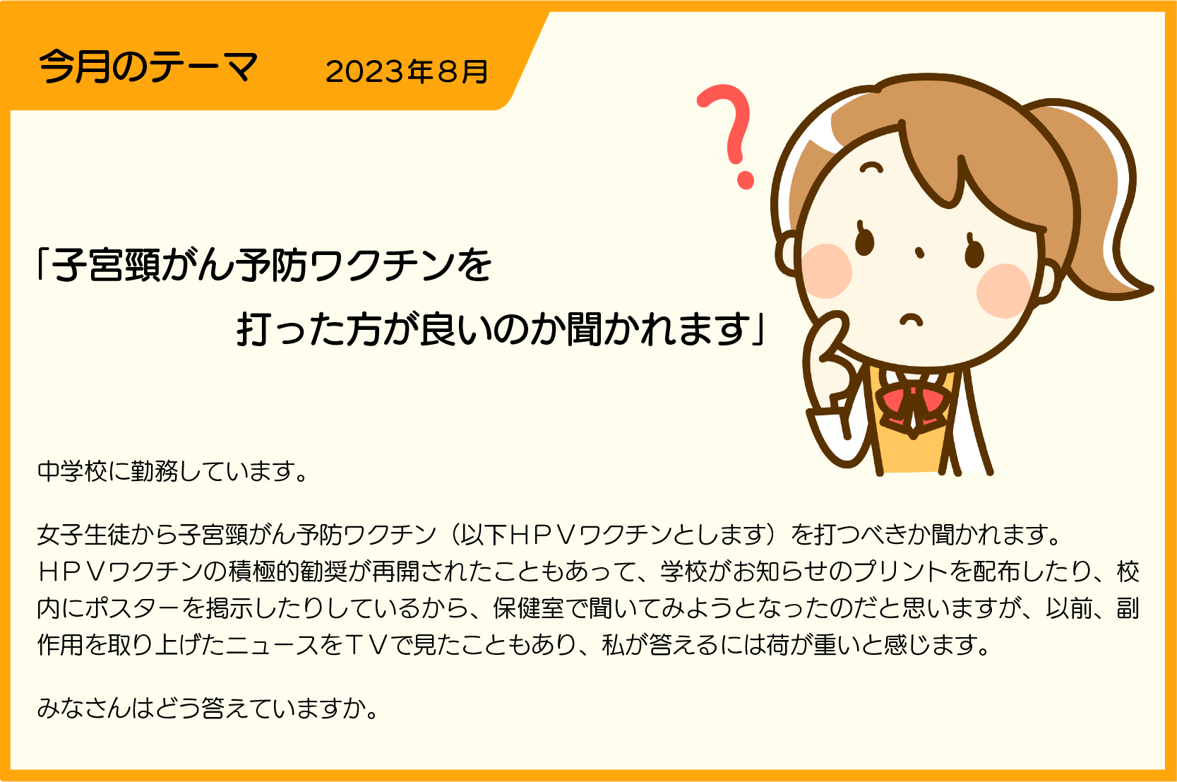 【SLIPERより】 子宮頸がんの原因のほとんどは性交で感染するヒトパピローマウイルス(HPV)です1)。現在、国内で接種できるワクチンは3種類1)あり、予防接種法による定期接種として公費で受けられます。予防接種は、ウイルスに感染していない初回性交前までに受けることが良いとされていることから、公費助成は小学校6年生から高校1年生の女性を対象としています。 日本では海外のHPVワクチン情報を知る機会がありませんが、既に広く普及しており、カナダ、イギリス、オーストラリアなど接種率が8割を超える国もあります。スウェーデンではワクチン接種を受けた人全体では63%、そのうち17歳未満で接種した人では88%もがんになるリスクが減少していたことになり、若い時期での接種の方が、よりがん予防に効果的だったことがわかる成果も報告2)されています。 平成25年(2013年)にHPVワクチンが定期接種化されてから、相談者さんの言う通り接種部位以外の体の広い範囲で持続する疼痛が報告されニュースになりました。このためHPVワクチンの副反応について分析・評価され、令和3年(2021年)11月に接種による有効性が副反応のリスクを明らかに上回ると認められました。 平成25年(2013年)から令和3年(2021年)に接種を勧める取り組みが差し控えられていた期間に、公費ワクチン接種の機会を逃した人がいます。その対応として、平成9年度生まれから平成17年度生まれの女性は令和4年(2022年)4月~令和7年(2025年)3月の3年間公費ワクチン接種3)ができます。この時期が過ぎてしまっていたとしても、今後、性交する可能性が高い若い女性であればワクチンを受けることは有効です。 荷が重いからと返答するのを避けるのではなく、養護教諭として、上記のような正しい情報を教えましょう。そして、中学生では、まだ自分だけで判断できない可能性もあります。その情報を基に保護者とよく話し合って決めることを伝えましょう。思い悩むようなら、案内通知に書かれてある区市町村の窓口や厚労省のHPVワクチン相談窓口4)に疑問点や不安な点を相談してみることを勧めましょう。 最後に、ワクチンを受けたからと言って、子宮頸がんに絶対にならないとは言い切れません。ワクチンは全ての型のHPV感染を予防できないため、ワクチンを受けた人も定期的ながん検診は受ける必要があることも添えて伝えてください。 1)政府広報オンライン 子宮頸がんの予防効果が高い9価HPVワクチン が公費で接種可能に https://www.gov-online.go.jp/useful/article/202306/1.html (2025.3.30) 2)Buzz Feed News 17歳未満でのHPVワクチン接種で子宮頸がんを88%減少 がん予防効果を示した論文は世界初 https://www.buzzfeed.com/jp/naokoiwanaga/hpvv-cervical-cancer (2025.3.30) 3)厚生労働省ヒトパピローマウイルス(HPV)ワクチンの接種を逃した方へ~キャッチアップ接種のご案内~ https://www.mhlw.go.jp/stf/seisakunitsuite/bunya/kenkou/hpv_catch-up-vaccination.html (2025.3.30) 4)厚労省 相談窓口 https://www.mhlw.go.jp/bunya/kenkou/kekkaku-kansenshou01/inful_consult.html (2025.3.30) |