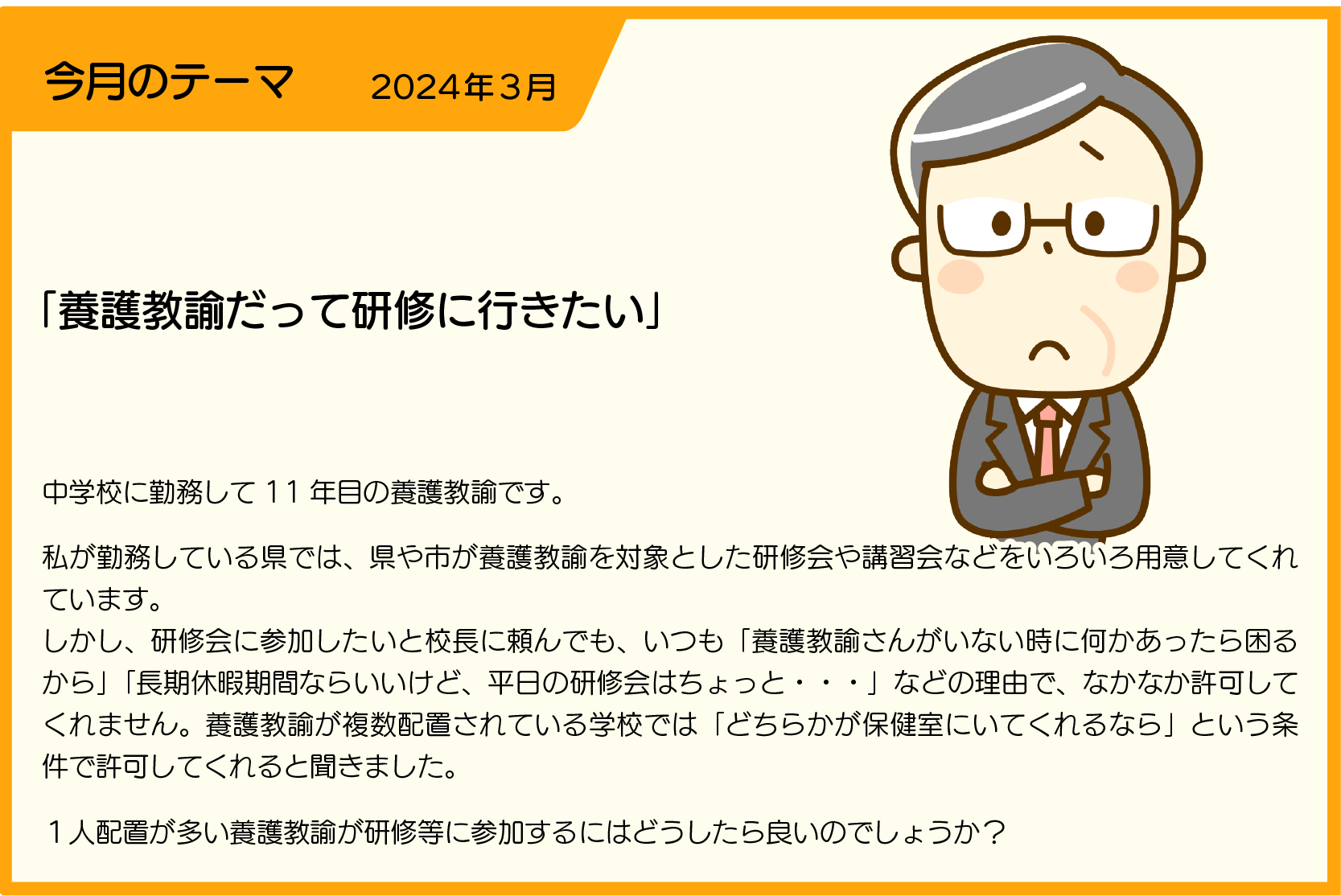 若手の頃、休み時間に補食が必要な子がいたため、研修(出張)に出ることを良く思わない管理職にあたったことがあります。地区の養護教諭部会で先輩方に相談したところ、養護教諭部長から若手養護教諭こそ研修に出してほしいとお願いしてもらい、研修に出たことを思い出しました。研修に出るために、補食について他の職員にも協力してもらいました。(今では当たり前ですが…)研修に出た際は管理職にお礼や内容の報告しました。管理職も徐々に研修への参加に理解を示してくれるようになりました。 | [1] | 2024/03/07 15:08 |