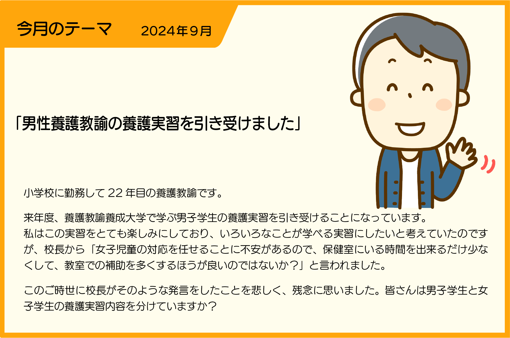 【SLIPERより】 ・近年の女性の社会進出は目覚ましく、総務省の「2023年度労働力調査」では女性の就業者数は3059万人で、雇用者全体の45.3%となっています。しかし、現状として雇用者数に男女比がある職業は多々あります。 ・【看護師】(令和4年衛生行政報告例(就業医療関係者)の概況) ・女性91.4% 男性8.6% ・【保育士】(令和2年保育士登録者数等(男女別)) ・女性96.0% 男性4.0% ・【幼稚園教諭】(令和6年学校基本統計) ・女性93.3% 男性6.7% ・【養護教諭】(令和6年学校基本統計) ・女性99.8% 男性0.2%、 ・そしてこのような職業別の男女比率については、世界データでも同様の傾向を示していますhttps://honkawa2.sakura.ne.jp/2705.html (2025.3.30)。 ・現在でも、男女で上記のような雇用差があるので今回の「女子児童の対応を任せることに不安がある」といった校長の発言があったのだと思います。 ・しかし、大学や専門学校などは、男女を分けず実習生として配慮すべき点を十分に学ばせた上で、実習先に学生を送り出し、上記のような資格や免許の取得の実習を受け入れている学校や施設の多くも、男女に差をつけずることなく、平等な実習を実践していると思います。 ・教育の場においても、「男性の仕事」「女性の仕事」といった概念を払拭した、新しい考え方を持つ時代になっています。 ・養護実習は男女関係なくできますが、女子児童に触れる場合や二人きりなる場合は、女性の教員に代わるか、女性の教員を同席させることも場合によっては必要な状況もあることを指導しておきましょう。 ・男性養護実習生が女子児童のプライベートゾーンまたはプライベートゾーンの近くを視診・触診する場合や着替えをさせる場合は、あなたが傍にいて女子児童が不快な思いをしないよう配慮すること、また、女子児童の悩み相談を聴く場合には、扉を開放することを指導しましょう。 ・誤解や要らぬ疑いをかけられることがないよう、自身を守るためにも、実践を通して、今後、男性養護として働いていくことに繋がる具体的なアドバイスができる機会になると思います。 ・養護教諭の実習生を引き受けるのはあなたです。校長が上記のような発言をしてしまう背景を把握しつつ、男女に関係なく、自分の後輩を育てるために出来ることを考えて、実り多い実習となるような計画を立ててあげましょう。 |