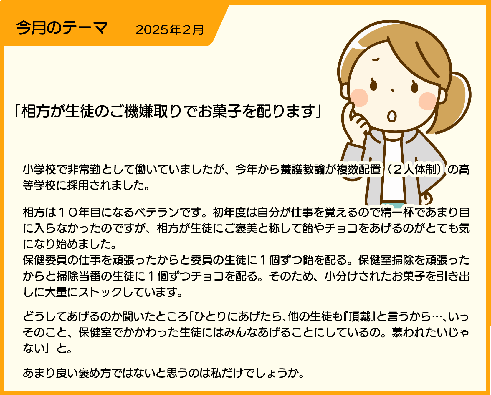 【SLIPERより】 小学校と比較したら、尚更、安易にお菓子を配る相方の行動に、あなたは驚きと疑問を感じたことでしょう。その疑問を「教育的報酬の意味」と「養護教諭複数配置の在り方」から考えてみましょう。 教育的報酬としてのご褒美は意欲を高める第一歩として限定的に使う分には効果があると思われますが、掃除当番や保健委員の仕事のたびに繰り返され、多くの生徒の手に配られれば、かえってマイナスになります。さらに保健室に行けばお菓子がもらえると生徒間で噂が広がり、それが悪い印象として各家庭に広がる可能性もあります。そして、もらった生徒が他の生徒にあげてしまう可能性もあります。小分けの袋には成分表記がないので、知らずに食べてアレルギーを発症するなど、大きなトラブルに繋がる可能性もあり、事故になると相方さん個人の問題だけではなく、学校としての責任も問われます。 また、相方さんは、お菓子をあげることで自身が慕われていると勘違いしている可能性もあります。生徒のモチベーションを上げるには、褒美をあげるなど外発的動機付けは一時的なもので、長期的に行動を維持していくためには、内発的動機付け(内面から湧き上がる意欲)が必要です。 複数配置の一方が生徒への対応が違い過ぎていたり、一方が委縮して何も言い出せない環境であったりしては、今後、あなたが2人体制で養護教諭としての仕事を続けにくくなることも考えられます。複数配置は、2人が同じゴール(方向性)を共有できていることと、疑問や少しでも違和感が生まれたら話し合いをし、折り合いをつけて、最適な解を出せることが必須です。あなたが、先住のベテラン養護教諭に意見するのは大変かもしれませんが、まずは勇気を振り絞って「菓子を与えなければ慕われないのでしょうか・・・」ともう一歩踏み込んで安易にお菓子を配ってしまう理由を聞いてみましょう。相方さんは、実は自分に自信がなくて、手っ取り早く生徒との信頼関係を結びたいが為に、物を与えるという安易な手段に陥っている可能性もあります。「2人の養護教諭で指導方法に偏りがあってはいけないと思うので・・・」と、話しを進めて、菓子を与えるより、仕事の頑張りに感謝の言葉や褒める言葉を投げかける方が効果的ではないかと提案してみてはいかがでしょうか。それでも、相方からの答えが納得のいかないものであれば、上記のような今後起こりえる学校としての問題を保健主事や管理職に説明し、今後の対応を相談してはいかがでしょうか。 |