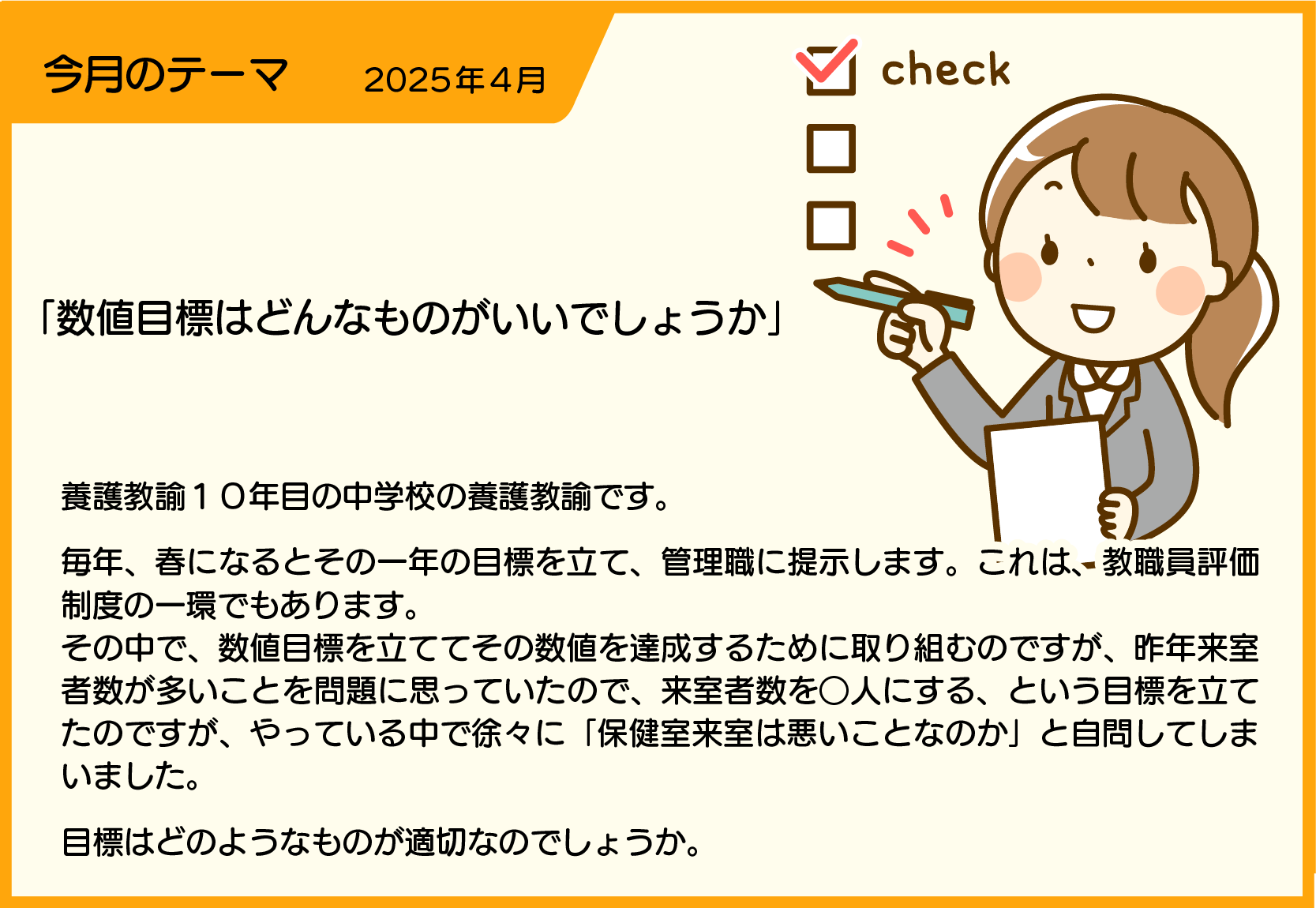 そもそも数値目標として「○%削減」「{emj_ip_}{emj_ip_}円以上の売り上げ」などが明記できる目標と、出来ない目標があると思います。 保健室来室者数は「学校種」「学校規模」「教員数」「感染症の流行」などさまざまな要因で変化する数字だと思います。 そこで、保健室来室者の全体数を減らすことを目標にするのではなく、「体育や部活時のケガによる来室者数を減らす」「熱中症による来室者数を減らす」「生理痛による来室者数を減らす」など、増加している保健室来室理由の具体的人数や年次推移などを公表し、加えて数値目標を達成するための対応策「熱中症防止のため、授業と部活開始前に必ずWBGTを計測する」「生理痛対策の保健授業を実施する」などとセットにしてはいかがでしょうか? 学校は営利目的の企業ではありませんが、本来、数値目標とは上記のような流れを丁寧に議論して、決定すべき数字だと考えます。 |