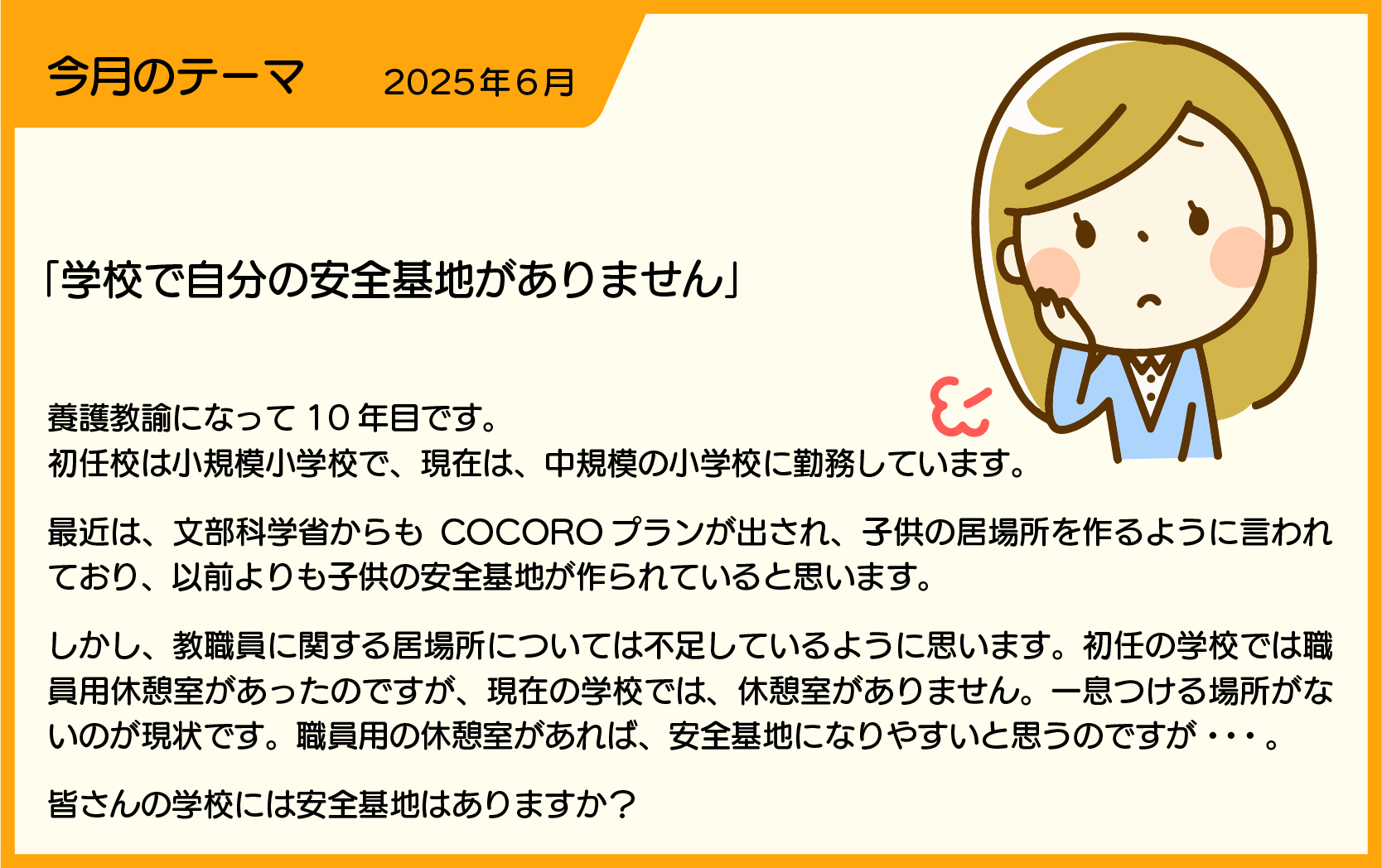 【SLIPERより】 養護教諭として10年間の経験を積まれ、教育現場の安全基地づくりに真摯に向き合っていること、とても素晴らしいです。COCOROプラン1)の推進によって、子供たちの安心できる場所が増えているのは現場でも実感します。一方で教職員の「居場所」が不足していることについても同感です。課題と言えると思います。 職員用の休憩室がないという状況では、心身をリフレッシュする時間が確保しづらくなり、日々の業務負担がより大きく感じられることにつながります。安全基地は子供だけでなく、大人にも必要なものです。職員が適切に休息を取れることで、より質の高いサポートを子供たちに提供できるという観点からも、休憩室の必要性を訴える価値はあるでしょう。 まず、現場でできる工夫として、職員が気軽に集まれる「リフレッシュスペース」を設けることが考えられます。例えば、職員室の一角をリラックスできる空間に変える、小規模でもいいので休憩専用の場所を確保するなど、小さな取り組みから始めることが可能です。また、管理職の理解を得るために、「職員のメンタルヘルスが子供たちの支援にも直結する」という視点から、休憩スペースの必要性を伝えるのも一つの方法です。 事務所衛生基準規則では、第四章 休養 第19条で「事業者は、労働者が有効に利用することができる休憩の設備を設けるように努めなければならない。」2)とされています。平成4年には事業者が構ずべき快適な職場環境の形成のための措置に関する指針に、「労働により生ずる心身の疲労については、できるだけ速やかにその回復を図る必要がある。このため、心身の疲労の回復を図るための施設の設置・整備をはかること。」3)と示されています。そのため、職場環境の改善のために、管理職や関係者と相談しながら、休憩スペースの確保を検討しましょう。職員のメンタルヘルスや業務効率の向上にもつながるため、提案の価値は十分にあると思います。 1)COCOLOプラン 2)労働基準法活用ガイド 3)事業者が構ずべき快適な職場環境の形成のための措置に関する指針(平成4年) 参考文献 学校にローアンの風を すぐに使える労働安全衛生法 |