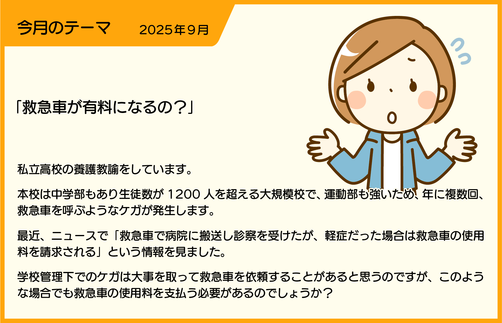【SLIPERより】 最近、養護教諭の間でこの話がよく出るようになりました。きっかけは2025年6月に茨城県水戸市内の学校で子どもがけがをしたので救急車で病院に搬送したところ、この搬送は緊急性がなかったと判断されて「選定療養費(7700円)」が徴収されたというニュースが2件あったからでしょう。 このニュースが「軽症で救急車を呼ぶと、救急車の使用料7700円が必要になる」というように伝わっているのだと思いますが、選定医療費は救急車の使用料ではありません。 2016年4月の健康保険法改正で、200床以上の地域医療支援病院は、他の医療機関等からの紹介状を持たない初診の場合、診療費の他に選定療養費(7,700円、歯科は5,500円)を徴収することが義務化されましたが、診療報酬制度上、「救急の患者」からは徴収してはならないとなっています。しかし、近年、救急車による搬送が必要ないような安易な救急車要請(救急車搬送の約半数が軽症)が増え、本来、救急搬送が必要な患者に影響を及ぼすことは増えてきたので、この制度を利用し、救急車要請時の緊急性が認められない場合に対象病院において徴収する都道府県や市区町村が増えてきたのです。 つまり、軽症患者の救急車の使用が有料になったというわけではなく、救急車要請時の緊急性が認められない場合に選定療養費を請求されることがあるということです。しかし、18歳未満の小児医療や心身障がい者医療などの自治体等による公費負担医療制度の対象となっている人については、選定療養費の対象外としている地域もありますので、確認が必要です。 このような現状を受け、茨城県は学校現場で救急車を呼ぶべきか迷う際は「#7119」や「#8000」などの救急電話相談に相談し、要請すべきだと助言された場合は原則徴収しないと各校に通知しました。 「呼吸停止」「意識混濁」「大出血」などの緊急時は迷わず救急車を要請する必要がありますが、救急車を呼ぶべきか迷う時は、同僚の養護教諭に相談したり、「#7119」や「#8000」を利用したりする方法もあります。同時に年度当初に一般教員、部活担当者、保護者などにも上記を説明しておき、重症度によって「選定療養費」を請求される可能性があることを周知しておきましょう。 #7119(救急安心センター事業):急なけがや病気で救急車を呼ぶか迷ったとき、医師、看護師、相談員などの専門家からアドバイスを受けることができる。現在、全国の24地域で実施されている。 #8000(こども医療電話相談):夜間や休日の子どもの急な病気やけがに関して、病院を受診すべきか、自宅で様子を見るべきかを判断する際に、医師や看護師に電話で相談できる。現在、47都道府県すべてで実施されている。 (https://www.mhlw.go.jp/stf/seisakunitsuite/bunya/newpage_55223.html) |